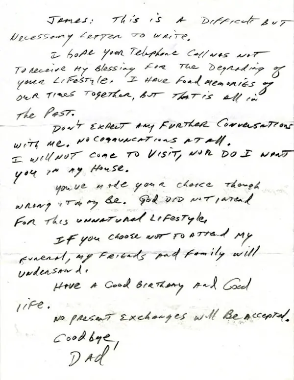 Hace cinco años, un joven estadounidense llamado James le telefoneó a su padre para comunicarle que era gay. Días después, el chico publicó en "Reddit" la carta donde su progenitor le respondía. El Daily News en su versión online reporta que la publicación del escrito en el foro de ateísmo fue recibida con gran efusión por parte de los usuarios, y ahora es viral; sin embargo, James señaló que no lo había hecho con esa intención. Asimismo, el joven declaró al Daily News que él es un joven de 33 años "bien adaptado", "pero muchos jóvenes homosexuales tienen dificultad para hacerlo y necesitan ayuda, compasión y orientación, para sobreponerse a lo que sin duda será uno de las experiencias más difíciles de la vida", dijo. El medio señala que ante la controversia sobre el matrimonio gay, James escribió desde Los Angeles que ese sentimiento antigay "se extiende a familias como la mía". Agrega, "aunque la mayoría de los cristianos no se van tan lejos como para desconocer por completo a sus hijos gays", como lo hizo su padre. Finalmente, James señaló a Daily News que realmente "los enemigos del matrimonio gay contribuyen a romper la verdadera y sagrada unión familiar". Traducción "James: esta es una carta difícil, pero necesaria de escribir. Deseo que tu llamada telefónica no haya sido para recibir mi bendición por tu estilo de vida degradante. Tengo buenos recuerdos del tiempo que pasamos juntos, pero todo eso quedó en el pasado. En el futuro, no esperes conversar conmigo. No habrá comunicación en absoluto. No te iré a visitar, ni yo te quiero en mi casa. Tú hiciste tu elección, aunque pueda ser la incorrecta. Dios no tenía la intención de ese antinatural estilo de vida. Si decides no asistir a mi funeral, mi familia y amigos lo van a entender. Ten buen cumpleaños y una buena vida. Cualquier intercambio de regalos no será aceptado. Adiós, Papá”. En mi opinion personal me parece muy triste que un Padre no acepte las decisiones de su hijo,ya que en la vida es un camino de ensayo y error ... para aprender a ser una mejor persona que ayude a la humanidad,no importando su condicion sexual