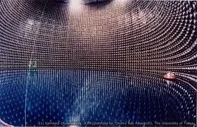 Super-Kamiokande, o Super-K, es un observatorio de neutrinos localizado en Japón. El observatorio fue diseñado para estudiar los neutrinos solares y atmosféricos, y para detectar el decaimiento de protones y neutrinos provenientes de supernovas en cualquier parte de nuestra galaxia. El Super-K está localizado a 1.000 m bajo tierra en la mina de Mozumi, propiedad de la compañía Kamioka Mining and Smelting Co. en la ciudad de Hida (antiguamente conocida como Kamioka), en Gifu, Japón. El mismo consiste de 50.000 toneladas de agua Obito pura rodeadas por cerca de 11.000 tubos fotomultiplicadores. La estructura cilíndrica tiene 40 m de alto y 40 m de ancho. La interacción de un neutrino con los electrones o los núcleos de agua puede producir una partícula que se mueve más rápido que la velocidad de la luz en el agua (aunque, claro está, más lentamente que la velocidad de la luz en el vacío). Esto crea un cono de luz a causa de la radiación de Cherenkov, el equivalente óptico de una barrera del sonido. El patrón característico de este destello provee información sobre la dirección y, en el caso de los neutrinos atmosféricos, la clase de neutrino que llega. La diferencia en el tiempo que se experimenta entre la llegada a la pared del detector de la parte superior del cono y la inferior puede usarse para calcular la dirección en la que se aproxima la partícula; cuanto más grande sea la diferencia, mayor será el ángulo de la horizontal de la trayectoria de la partícula. El tipo de partícula puede inferirse dependiendo de la nitidez del borde del cono. Un muon penetra fácilmente, tal que raramente interactúa con el agua, por lo que produce un cono bien definido. Un electrón regularmente interactuará, causando lluvias de partículas adicionales y, por ello, se detectará un cono más borroso. La construcción del Observatorio Subterráneo de Kamioka, el predecesor del actual Observatorio de Kamioka (Instituto para la Investigación de Rayos Cósmicos, Universidad de Tokio) comenzó en 1982 y concluyó en abril de 1983. Su propósito fue la detección del decaimiento de protones, una de las interrogantes fundamentales de la física de partículas elementales. El detector, llamado KamiokaNDE (Kamioka Nucleon Decay Experiment), era un tanque que contenía 3.000 toneladas de agua pura y unos 1.000 tubos fotomultiplicadores acoplados a la superficie interna. Tenía un tamaño de 16,0 m de altura por 15,6 m de diámetro. En 1985, se actualizó el detector para lograr que observara neutrinos solares. Como resultado de ello (KamiokaNDE-II), el detector fue suficientemente sensible como para detectar los neutrinos provenientes de la explosión de una supernova observada en la Gran Nube de Magallanes en febrero de 1987. Neutrinos provenientes del Sol fueron detectados en 1988, lo que ayudó a avanzar en las investigaciones sobre astronomía y astrofísica de neutrinos. La habilidad del experimento Kamiokande para detectar la dirección de los electrones producidos en la interacción de los neutrinos solares permitió a los investigadores demostrar, por primera vez, que el Sol, verdaderamente, produce neutrinos. A pesar del éxito en la observación de neutrinos, Kamiokande no detectó el decaimiento de protones, su primer objetivo. Era necesaria mayor sensibilidad para observar neutrinos con una precisión estadística más confiable. Esto condujo a la construcción del Super-Kamiokande, con un volumen diez veces mayor que el inicial y tubos fotomultiplicadores que el Kamiokande. Super-Kamiokande inició sus observaciones en 1996. La Colaboración Super-Kamiokande anunció la primera evidencia de oscilaciones de neutrinos en 1998, consistente con la teoría de que los neutrinos no tienen masa nula (aun cuando el valor sea muy pequeño). Hasta entonces, toda la evidencia observacional apuntaban a que los neutrinos no tenían masa, aunque los teóricos habían especulado lo contrario por muchos años. El 12 de noviembre de 2001, varios miles de tubos fotomultiplicadores del detector Super-Kamiokande implosionaron en una aparente reacción en cadena (las ondas de presión de cada tubo que implosionaba fueron quebrando los tubos contiguos). El detector ha sido parcialmente reparado, redistribuyendo el resto de los tubos fotomultiplicadores y añadiéndoles un escudo protector de acrílico, con la esperanza de que esto impida otro desperfecto del mismo tipo (SuperKamiokande-II). En julio de 2005, se comenzaron las preparaciones para restaurar el detector a su forma original, reinstalando unos 6.000 tubos fotomultiplicadores. Se completó en junio de 2006 (SuperKamiokande-III). link: https://www.youtube.com/watch?v=0sPbKn5-hfE