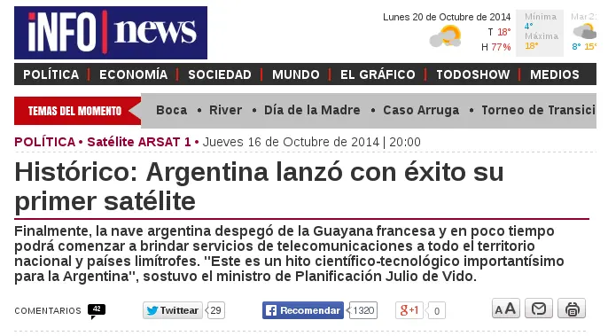 Mentira #1 Es el primer satélite argentino Aunque es verdad que es el primer satélite geoestacionario, el aparato de propaganda del gobierno lo presentó como si fuese el primer satélite lanzado por Argentina, pero lejos de la verdad, Menen lanzó más satélites en menos tiempo y hasta De la Rua lanzó dos... Antes del ArSat-1, ocho satélites argentinos fueron lanzados al espacio Para el kirchnerismo fue el primero, pero...Comenzaron a lanzarse en 1990 y hasta el Gobierno de la Alianza hizo su aporte espacial El satélite ArSat-1 lanzado ayer al espacio se encontrará allí con otros satélites argentinos que han sido lanzados en estos años. La “soberanía espacial”, que la presidenta Cristina Fernández de Kirchner presentó como una conquista de su Gobierno, empezó en realidad mucho antes: ArSat-1 es en realidad el noveno satélite lanzado por la Argentina al espacio. Y es el segundo construido durante el kirchnerismo. La Asociación Argentina de Tecnología Espacial reconoce al menos ocho pioneros para el ArSat-1. El primer objeto argentino pueso en órbita, Lusat 1, se remonta a 1990. Fue desarrollado por un grupo de radioficionados argentinos, mediante AMSAT Argentina y construido en parte en Argentina y el resto en AMSAT NA en Boulder, Colorado. Su misión: proveer comunicaciones a todos los radioaficionados del país y del mundo. Otros cuatro satélites fueron enviados al espacio durante el gobierno de Menem. En 1996 hubo dos lanzamientos: el de MuSat (desarrollado por la Asociación de Investigaciones Tecnológicas de Córdoba AIT y el Instituto Universitario Aeronáutico), cuyo objetivo era fotografiar al país con imágenes de baja resolución, para seguimientos meteorológicos; y el de Sac-B, desarrollado por la CONAE y construido por la empresa INVAP, aunque nunca llegó a funcionar y se incendió en la atmósfera. Al año siguiente llegó Nahuel 1-A, utilizado para telecomunicaciones como el ArSat, aunque este fue construido íntegramente en el exterior. Y en 1998 fue puesto en órbita Sac-A, desarrollado por la CONAE y construido por INVAP. Su objetivo era hacer un seguimiento de la comunidad de ballenas Franca Austral y tomar fotografías del país para interpretar los ciclos de inundaciones y sequías. Pero al cabo de unos pocos meses su órbita decayó y también se quemó en la atmósfera. Hasta el gobierno de la Alianza puede exhibir un par de satélites enviados al espacio. El 21 de noviembre de 2000 fue lanzado el Sac-C, un satélite argentino de teleobservación, que estuvo en operación hasta el 15 de agosto de 2013. El 6 de diciembre del año 2001, poco antes del estallido social, el Pade entró en órbita como parte de la misión STS-108 de la NASA. Fue utilizado por la Asociación Argentina de Tecnología Espacial para realizar experimentos en el espacio y volvió a Tierra 15 días más tarde. Finalmente, el Sac-D es el antecesor más inmediato del ArSat. Diseñado y contruido íntegramente en el país, la CONAE informó que “su objetivo científico está orientado a obtener nueva información climática a partir de las mediciones de salinidad y una nueva visión de la circulación y procesos de mezcla en el oceáno, así como detectar focos de alta temperatura en la superficie terrestre para la obtención de mapas de riesgo de incendios y humedad del suelo para dar alertas tempranas de inundaciones”. Fue puesto en órbita el 10 de junio de 2011. Mentira #2 Es un satélite 100% argentino Esta es la más burda de las mentiras, gran parte del satélite argentino proviene de otros países con tecnología más avanzada. Por ejemplo, la carga útil del satélite, es decir, todos los instrumentos tecnológicos que le permiten realizar su función, han sido fabricados por Thales Alenia Space, una empresa europea que fue licitada por INVAP para esta tarea. Lo mismo pasó con los sistemas de propulsión y el ordenador de abordo, que han sido encargados a Astrium, una filial de la multinacional europea EADS. De hecho, la gran mayoría de los componentes físicos del ARSAT-1 han sido fabricados fuera de Argentina. El satélite ‘100% argentino’ que se fabricó en Europa Llegar al espacio con tecnología propia es un orgullo para cualquier país. En América Latina, cada vez son más los estados que construyen y lanzan sus primeros satélites con fines científicos y otros para telecomunicaciones. Estos días el centro de atención en este campo es Argentina. El país espera la puesta en órbita de su primer satélite de gran tamaño, el ARSAT-1. Este artefacto de casi tres toneladas orbitará a 36.000 kilómetros de la Tierra y dará a Argentina una mejor cobertura de televisión digital, internet y telefonía móvil. Desde el Ministerio de Planificación Federal se alaba el lanzamiento del primer satélite de comunicaciones “ciento por ciento nacional” y se le pone como ejemplo de un “nuevo modelo de desarrollo” basado en la tecnología y la investigación. “Hasta hace diez años pensar que los satélites podíamos hacerlos nosotros y no comprarlos al extranjero por medio de licitación era imposible. Hoy hasta hay proyectos para exportarlos”, dijo hace unos días Héctor Otheguy, gerente general de INVAP, la empresa pública a la que se encargó la construcción del satélite. Pero ni todo el ARSAT-1 es argentino ni solo Argentina ha participado en su desarrollo. Como sucede en la mayor parte de los casos en los que un país sin un fuerte arraigo en el sector espacial da sus primeros pasos, gran parte del satélite argentino proviene de otros países con tecnología más avanzada. Por ejemplo, la carga útil del satélite, es decir, todos los instrumentos tecnológicos que le permiten realizar su función, han sido fabricados por Thales Alenia Space, una empresa europea que fue licitada por INVAP para esta tarea. Lo mismo pasó con los sistemas de propulsión y el ordenador de abordo, que han sido encargados a Astrium, una filial de la multi