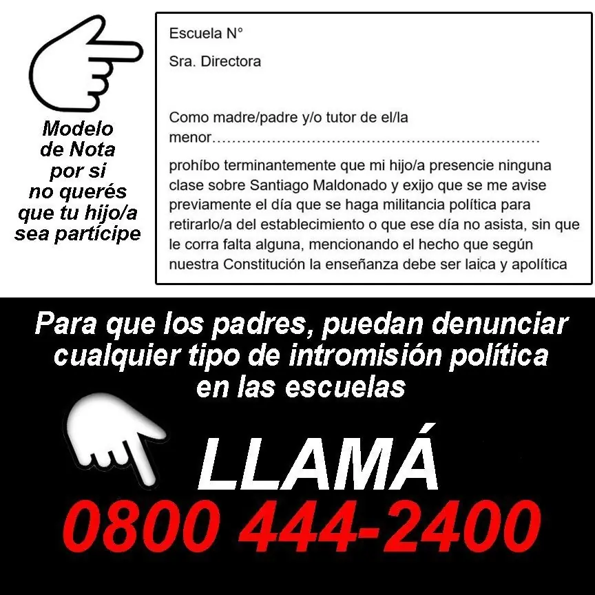 Buenas Tardes, me tope con varios Post y varias noticias en diarios y chimentos de viejas chotas en el supermercado y/o almacen de barrio... en todos esos chimentos y perdidas de tiempo ( INTERACCIONES DE CONSUMIDOR - CAJERA) me vi envuelto en un dilema que pasa a nivel historia familiar personal. En mi familia siempre existieron docentes, Mi Abuela, Mi Mamá y hoy en dia Mi Esposa. Al mismo tiempo que me rodie de personas abocadas a la docencia, Amigos, Familiares, Vecinos Etc etc etc. En todos los Casos JAMAS !!! pero jamas, se estuvo de acuerdo en Politizar la Escuela, La enseñanza. No podemos Creer lo que esta pasando hoy en dia de como la politica se te mete en un eslogan Autorepetible de frases como dice @Nico2012 "Perón vuelve" "Nunca más" "Ni una menos, vivas nos queremos" "Con vida lo llevaron, con vida lo queremos" "El amor vence al odio" "Perón, Perón, qué grande sos" La Primer educacion va a nacer en LA CASA DE CADA UNO, pero el refuerzo Siempre va a ser la Escuela. Por Eso... Si no estas de Acuerdo con que LE INTENTEN enseñar a Tus Hijos/Sobrinos/Hermanos etc, algo que tenga que ver con "MALDONADO" imprimí esta imagen. Listo !!! RESUMEN NIVEL 5,999999 periódico: * Si no te interesa lo que diga la escuela sobre MALDONADO, Imprimí esta Nota y enviala al directivo correspondiente.
