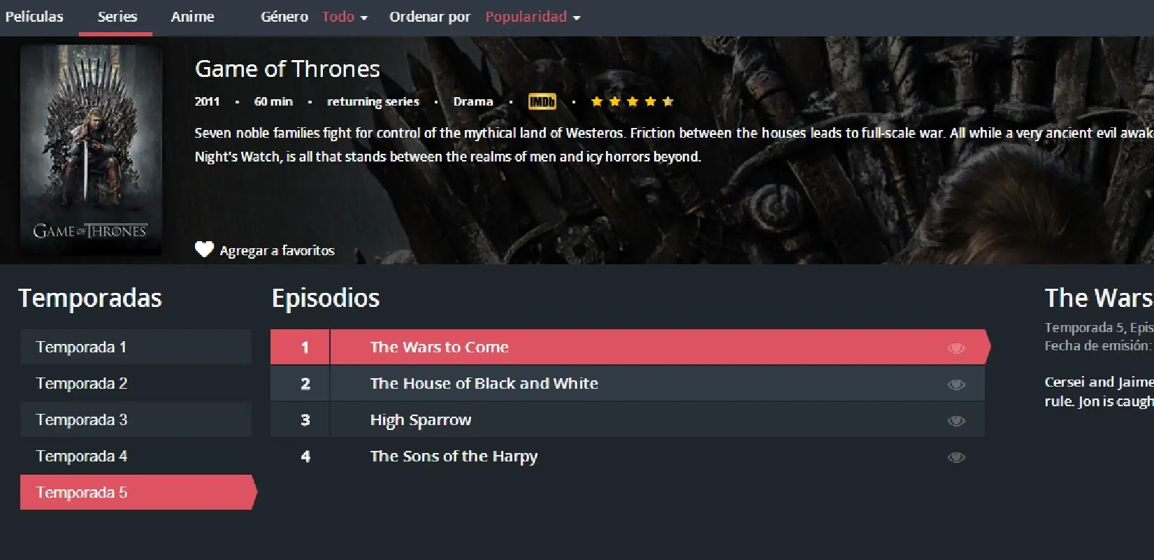 Filtran los primeros 4 capítulos de la nueva temporada de Game of Thrones Los primeros cuatro episodios de la quinta temporada de Game of Thrones (Juego de Tronos) se filtraron por la red un día antes de su esperado estreno oficial y se efectuaron más de 100.000 descargas en las primeras tres horas, informó The Hollywood Reporter. Tras la filtración, HBO indicó en un comunicado que el canal está trabajando para averiguar quién es el responsable. - Foto:Google Images EFE Los episodios aparecieron por primera vez en un torrente de descarga privado este sábado, pero pronto se multiplicaron a otras páginas piratas como The Pirate Bay o KickassTorrents, a tan solo unas horas del estreno mundial que tendrá lugar este domingo. Según apuntaron los medios, es probable que la filtración se haya producido a raíz de las muestras enviadas a la prensa con motivo del estreno. La cadena HBO, quien emite la serie, quería evitar precisamente que se piratearan los capítulos, por lo que trazó una estrategia para que la quinta temporada se estrenara en 170 países de manera simultánea. Tras la filtración, HBO indicó en un comunicado que el canal está trabajando para averiguar quién es el responsable. “Lamentablemente, parece que los cuatro episodios filtrados de la próxima temporada de Game of Thrones se produjeron desde un grupo de gente aprobado por HBO para recibirlos”, decía el comunicado. “Estamos trabajando activamente para evaluar cómo se produjo este incumplimiento”, añadió la cadena.