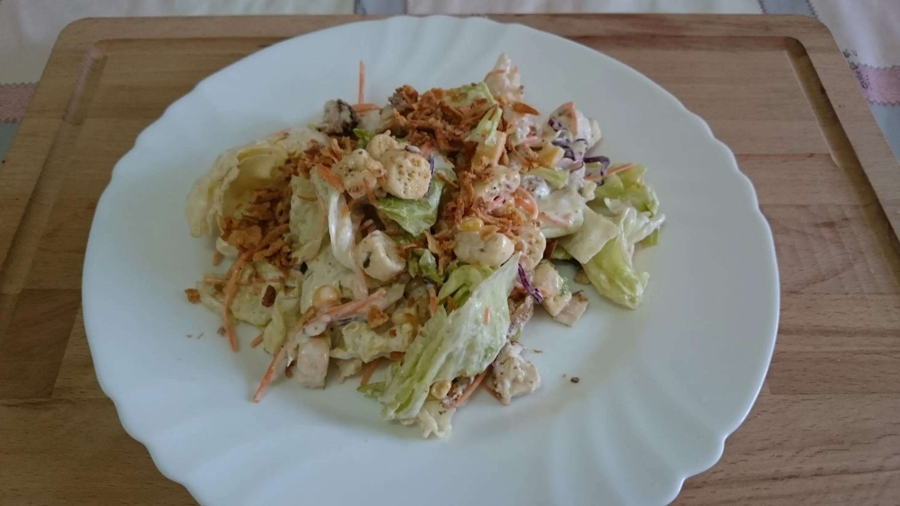 Hoy realizaremos una ensalada muy fácil y rápida de elaborar y para ello utilizaremos los siguientes ingredientes: INGREDIENTES: - Mezcla para ensalada (Lechuga, Zanahoria, Col roja) - Pollo empanado - 20 gr de Maíz Dulce - 30 gr de Picatostes o Pan Tostado - Salsa César link: https://www.youtube.com/watch?v=q8jS8nO71Ks