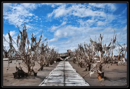 Las ruinas que emergen del lago Villa Epecuén, situada en la provincia de la capital argentina de Buenos Aires, es posiblemente hoy dia el lugar abandonado más desolador que se pueda encontrar por aquellas tierras. Toda su historia surge a partir de la creación de la villa junto a las orillas de la laguna Epecuén. En 1920, una gran parte de visitantes llegaban a la capital de Buenos Aires mediante la red ferroviaria Argentina, el Ferrocarril Sarmiento servía la estación de Villa Epecuén (Hoy día también abandonada), mientras que el Ferrocarril Midland y el Ferrocarril del Sud llevaba los pasajeros hasta la estación Carhué. Tras el incremento de los visitantes a la zona, y debido al auge que estaba cogiendo el lugar debido a la capacidad sanadora de sus aguas, en esa misma fecha se decide crear esta villa turística y de esta forma se desarrolla el turismo en Epecuén, llegando a contar con 5.000 plazas declaradas y 2.000 sin declarar. Eran 280 establecimientos, entre hospedajes, pensiones, hoteles y comercios que llegaron a recibir en las décadas de 1950 a 1970 a 25.000 turistas de noviembre a marzo. La Villa llegó a poseer 1.500 habitantes estables. . Pero la naturaleza no habia escrito todavía su última palabra… . El 10 de noviembre de 1985 el enorme caudal de agua rompió el terraplén de piedra y tierra que separaba la población de la laguna, e inundó gran parte de la localidad por lo que la villa desapareció por completo. Sobre 1986, el pueblo estaba envuelto ya por 4 metros de agua en sus calles, llegando en 1993 a más de 10 metros de profundidad y hoy dia, las ruinas parecen querer emerger de las aguas como si de Poseidón se tratara, volviendonos a mostrar en este caso, la desolación de un pueblo condenado, la desolación de un pueblo devastado al que la naturaleza le guardó la peor de sus caras. . En las siguientes instantaneas podemos ver lo que hoy dia aparece bajo esas aguas, sus calles anegadas… Su antiguo matadero, edificio santo y seña del lugar… Agua y más agua que nos demuestra una vez más que no deberiamos infravalorar tanto la naturaleza ya que esta siempre acabará teniendo la última palabra.