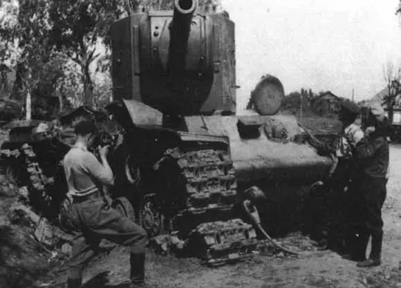Un monstruo en la carreteraDesde el 23 hasta 24 junio 1941 un solo KV-2 de la segunda división de tanques detuvo por 2 dias el avance de la 6ta Div Panzer(sep la misma que cayo en Stalingrado)cerca de la ciudad de Rassaynjay(Lithuania)El dia 22 el reconocimiento de la div, un Sdkfz. 250 informa que ha visto un solitario tanque cruzando el campo,posterior reconocimiento aéreo demostró que no había mas unidades soviéticas en la zona En la mañana del 23 de junio se supuso que el tanque se habria retirado durante la noche por lo cual era seguro enviar un convoy de 12 camiones,El KV-2 descubre la columna y destruye los 12 camiones.Nuevamente el KV es encontrado bloqueando la carretera bloqueando el aceso a 2 cabezas de puente sobre el rio dibissa, inmóvil ,debido a problemas mecánicos.cosa muy común en los kV-2Posteriormente los alemanes le dieron al KV-2 con todo lo que tenían...Fuego de cañon de los panzer,fuego de los pak38de 50mm,fuego de artilleria de 105mm,cargas de demolición colocados por los ingenieros de la división durante la noche, nada parecia poder poner fuera de combate al inoportuno KV que encima de sobrevivir al diluvio de proyectiles alemanes,destruyo los antitanques y un Flak36 de 88mm que fue traido para poder "derribar" al tanque sovietico Los Alemanes ofrecieron a la tripulación del KV la oportunidad de rendición y evacuación de los heridos la cual fue rechazadaSe solicito un ataque de Stukas,pero no habia aviones disponibles en la zonaPor fin el 25 de Junio, los alemanes deciden emplear operaciones combinadas para atacar al "plácido" tanque, Comienzan con ataques de obuses de 105mm , Se emplean los Panzers 38 (t) y Panzers IV del PzBn 65 como señuelos,para tratar de emplazar otro flak36, Los panzers lo rodean y comienzan a disparar desde tres sectores, el KV responde mientras desde atrás, el Flak era movido y desplegado a posición de disparo. El 88 dispara por primera vez, hay un ruido metálico y una nube de humo, al despejarse, se ve la torre del KV-2 comenzar a girar hacia el cañón apuntando hacia arriba..."...como si aún quisiera desafiar a sus atacantes",.....otro proyectil de 88mm cruza el aire, y otro y otro.......finalmente el tanque ruso queda quieto y silenciado, con el motor humeando . Al acercarse descubren que el tanque no se había incendiado y que solo 2 de los 7 proyectiles habían penetrado el blindaje y entrado en el motor. Un soldado alemán se sube al techo e intenta abrir la escotilla pero no lo logra, de repente la torre comienza a girar de nuevo...Los tripulantes aún estaban vivos, algunos soldados alemanes corren para cubrirse y otros, mas avispados, arrojan granadas por uno de los agujeros.....el ruido sordo de una explocion y la escotilla salta junto a restos humanos…fin de la tripulación, Después de dos días se reorganizo el avance de toda la Sexta División Panzer .detenida por un solitario y "molestoso" tanque sovietico,tanques que Adolfo decia que no eran "rivales" para los PanzersEn 1965 los trabajos de ampliación de la carretera en Raseiniya, obligan al traslado de los soldados sepultados en el antiguo lugar del combate, al desenterrar los cuerpos se encontraron algunos objetos personales, que permiten conocer la identidad de algunos de esos valientes: un par de cucharas, un carnet del partido comunista, y un pase expedido por la policía: los nombres son V.A. Smirnof, Paul Egorovich Ershov, un nombre incompleto: Yershov Pav ... , unas iniciales: SH.N.A. . Estos héroes fueron re-enterrados en un lugar cercano y se levantó un monumento a su memoria.lugar donde estaban enterrados originalmente los trpulantes del KV-2 Monumento a los heroes del KV-2 Aunque tuvieron oportunidad de escapar a su destino abandonando el tanque a la 1ra averia ,la tripulacion escogió su final y como se dice...."LOS HÉROES ELIGEN SU PROPIO DESTINO"