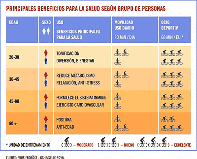 La bicicleta y tu salud Monta en bicicleta de forma regular y tu riesgo de infarto se reducirá... Beneficios de montar en bicicleta Montas en bici por placer, por estar en forma, por hacer amigos, por tener unas piernas bonitas.. une a todas estas una razón más: te presentamos un estudio concluyente que demuestra los beneficios para la salud de esta actividad. Si no has probado todavía a pedalear en serio... ¡engánchate a los pedales! Dos ruedas que te dan vida Con unos minutos diarios de bici, se puede disfrutar de una salud de hierro. Los que montan en bicicleta con regularidad ahorran en visitas al médico", como nos dice el Dr. Proböse, presidente del Centro de Salud de la Universidad Alemana del Deporte. Muchas personas que sufren molestias típicas como el dolor de espalda, tienen sobrepeso o adquieren enfermedades cardiovasculares, podrían gozar de muchos años de buena salud si se decidieran a usar más la bicicleta". Y una gran noticia para los que piensan que "ya están mayores": aunque no se empiece a hacer ejercicio regularmente hasta una edad avanzada los resultados siempre son palpables. ¿Qué hace la bici por tu salud? Directo a tu corazón y sistema cardiovascular Monta en bicicleta de forma regular y tu riesgo de infarto se reducirá tanto como un 50%. Con el ejercicio del pedaleo el ritmo cardiaco máximo aumenta y la presión arterial disminuye: el corazón trabaja economizando. Vas a reducir tu colesterol LDL (el "malo" , con lo que tus vasos tendrán muchas menos posibilidades de calcificarse, y a la vez aumentará tu HDL o colesterol "bueno". Los vasos sanguíneos se conservan flexibles y saludables cuando tus piernas se mueven cada día. Para la máxima eficiencia del ejercicio te recomendamos que hagas un trabajo de intervalos, con cambios de ritmo frecuentes. Es el tipo de entrenamiento que más rápido te hace mejorar. Calienta a ritmo suave, con una cadencia de pedaleo alta, alcanza tu ritmo de rodaje y luego intercala, cada 15 minutos, aumentos de intensidad de 3 a 4 minutos de duración en los que tu respiración se agite considerablemente (80 al 85% de tus pulsaciones máximas). Atacando la espalda Compensación. Es fundamental reforzar la musculatura abdominal cuando se trabaja la espalda. Cuando se adopta la postura óptima en el sillín, con el torso ligeramente inclinado adelante, la musculatura de la espalda está bajo tensión y se ve obligada a estabilizar el tronco. Muchos dolores de espalda provienen de la inactividad, que hace que se reduzca la nutrición de los discos intervertebrales y de esta forma van perdiendo su capacidad de amortiguar los impactos. La falta de ejercicio además hace que la musculatura de la espalda se vaya atrofiando, con lo que disminuye escandalosamente su función de "muelle". Los movimientos regulares de las piernas fortalecen la zona lumbar y previenen la aparición de hernias discales, al mantener la columna protegida de vibraciones y golpes. Además el ciclismo estimula los pequeños músculos de las vértebras dorsales, al hacer que constantemente se compriman y extiendan con el pedaleo, músculos que cuesta mucho hacer trabajar con cualquier otro deporte. Ï Compensa con algunos ejercicios abdominales, como los encogimientos con las piernas flexionadas cada vez que pedalees y tendrás en la bicicleta una de las actividades ideales para los que sufren de dolor de espalda. Ventaja. En la bici ni las articulaciones ni los cartílagos soportan cargas elevadas. A diferencia de las actividades en las que hay golpeo, como los saltos o la carrera a pie, con la bicicleta las rodillas funcionan protegidas, ya que del 70 al 80% del peso de tu cuerpo gravita sobre el sillón. Es la mejor alternativa a la carrera, con beneficios físicos muy similares, pues en la bici ni las articulaciones ni los cartílagos soportan cargas elevadas. Cuando las articulaciones se movilizan con poca presión los nutrientes pueden llegar a ellas con facilidad, y las sustancias beneficiosas se difunden en ellos fácilmente. Evita usar desarrollos muy duros si quieres conservar sanas tus rodillas. Intenta que tu cadencia de pedaleo no baje de las 70 rpm en ningún momento. Cuenta una vuelta cada vez que el pedal de un lado pase por el mismo sitio. Ahuyenta infecciones y aleja el cáncer Cada vez que montas en bicicleta estás dándole un impulso a la potencia de tu sistema inmunológico. Las células "comebacterias" del cuerpo, los fagocitos, se movilizan de forma inmediata gracias al pedaleo para aniquilar bacterias y células cancerígenas. Esta es la razón por la que a los enfermos de cáncer y SIDA se les recomienda ir en bicicleta. El Dr. Froböse destaca cómo la bicicleta es buena "para las personas que sufren algún proceso canceroso. Es como si las células que se encargan de la defensa del cuerpo, que estaban dormidas, despertaran mediante el pedaleo de un prolongado letargo". Los esfuerzos moderados refuerzan tu sistema inmune, mientras que los de intensidad máxima lo debilitan. Si estás expuesto a factores de riesgo (frío, personas ya infectadas cerca, estrés, poco sueño...) no hagas trabajos muy intensos y espera a equilibrarte para poder llevarlos a cabo. Dile adiós a las preocupaciones El cerebro se oxigena más y te permite pensar con más facilidad. Tu cuerpo segrega hormonas que te hacen sentir mejor y que pueden hasta llegar a ser adictivas, una sana adicción en todo caso. Está comprobado que los que montan en bicicleta regularmente sufren menos enfermedades psicológicas y depresiones. Pedalear es uno de los mejores antidepresivos naturales que existen. Las endorfinas, también llamadas hormonas de la felicidad, se generan con el ejercicio físico, de forma más notable cuando permaneces más de una hora sobre la bicicleta, así que ya sabes: ponte la alarma para que suene en una hora y no pares de pedalear hasta entonces, pero si quieres sentirte bien evita sobrepasar tus límites porque conseguirás el efecto c