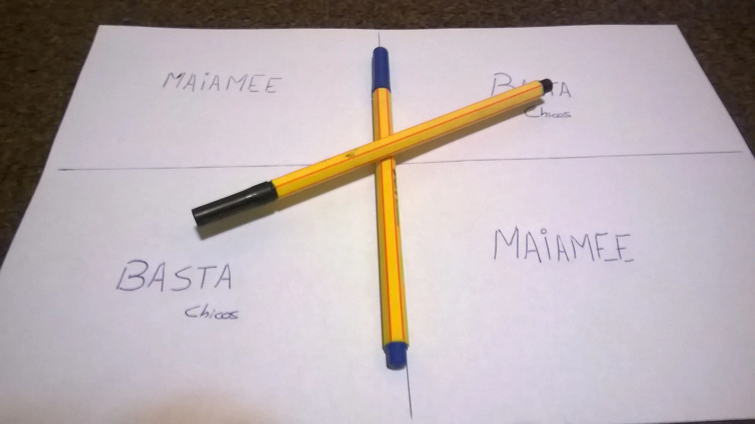 Un mito urbano, una leyenda de internet dice que si en una hoja de papel cruzas dos lapiceras o lapices y recitas las palabras "Charlie Charlie" y una pregunta este te respondera con "Si" o "No" No le hago caso a los mitos, por lo que decidi hacerlo con algo realcon un heroe, con un lider nato con el fantasma de Ricardo Fort - Lo sucedido es Real - No hubo heridos en este experimento, hasta que se demuestre lo contrario Posibles efectos secundarios tales como: - Erecciones descontroladas - Apariciones Procedere a explicar el procedimiento usado en este experimento Materiales Necesarios: - Hoja de Papel - Escuadra o Regla - Dos lapiceras o Microfibras -Una biblia (por las dudas) Primer Paso Colocamos la hoja de papel en el piso Segundo Paso Usando una lapicera dibujamos un par de lineas perpendiculares y centradas en la hoja Tercer Paso Escribimos las palabras "Maiamee" y "Basta Chicos" como se muestra en la imagen Cuarto Paso Colocamos las lapiceras en el centro de la hoja cuidando que la lapicera se encuentre en equilibrio Se necesita que no haya ninguna brisa en la habitacion La lapicera debe estar en perfecto equilibrio Quinto Paso Recitas una pregunta luego de la frase "Ricky Ricky" En este caso decidimos preguntarle donde se encontraba a lo que respondio... Ante este suceso, junto al equipo quedamos pasmados por el increible poderio y magnificenciadel espiritu. Decidimos realizarle otra pregunta en este caso fue ¿Estas vivo? y respondio... Ante dicha respuesta deducimos que el no deseaba responder, por lo que decidimos creer que el vive en nuestros corazones y siempre nos acompaña Certificada