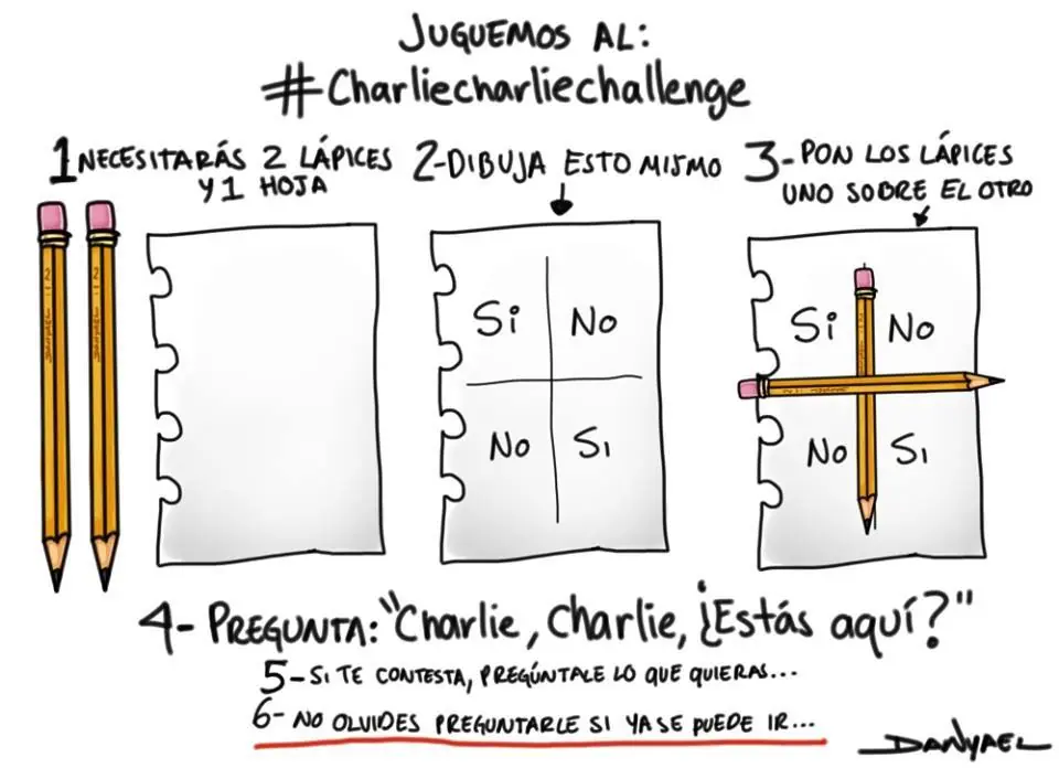El terrorífico ritual casero que lleva la Ouija a las redes sociales "El Desafío de Charlie" busca saber si una presencia está entre nosotros. ¿Real o Falso? "El Desafío de Charlie" es la nueva tendencia en las redes sociales. No se trata de algo agradable, de hacer bromas a los demás o de ejecutar un acto que luego pases a otros usuarios como el "Desafío de la Cubeta". Este es un poco más macabro. Se trata del simple "juego" de la Ouija, aquella tabla que en películas hemos visto sirve de comunicación con el mundo de los espíritus, pero que ahora llega en formato de hoja de papel y lápices. El #CharlieCharlieChallenge es el que busca que los usuarios hagan el experimento y suban el video a redes sociales. El tema es así: En una hoja de papel se escriben los casilleros "Si" y "No". Sobre ella se ponen dos lápices haciendo una cruz y se pregunta "Charlie Charlie ¿estás ahí?". Según muchos, el lápiz se moverá si es que hay una presencia. ¿Real o falso? Usuarios de redes sociales han subido sus videos, los que parecen reales. Sin embargo, hay muchos otros que han hecho burla del tema demostrado que es sólo uno más de los populares "fake" de Internet. Mira algunos de los ejemplos subidos a las redes sociales: link: https://www.youtube.com/watch?v=n22H5REUalk WHATS!!?? No te asustes Lince! link: https://www.youtube.com/watch?v=pDyyMkrJ6FU Y Muchos mas en Youtube Obvio como si no supieras! -.- Ayer fue hashtag topic mundial con #charliecharliechallenge Ustedes que opinan? REAL? Instrucciones para realizar el juego :/ AAAAHH Q SUSTOO!! la pmadre me voy a P!