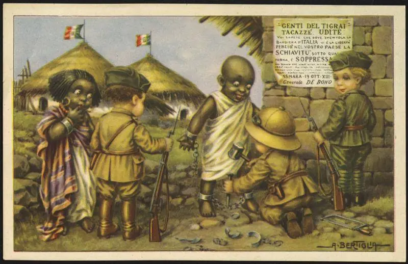 Es curioso, Etiopía cuando es intervenida por Mussolini, era un país cuyos gobernantes eras reyes financiados por la corona británica, el cual se sostenia mediante la esclavización de sus propios ciudadanos, que muy comúnmente o eran utilizados como animales de cargo, o eran vendidos a países como Turquía, llegado Mussolini, no solo prohibió la venta de esclavos (como puede verse en una de las imágenes), si no que también les dio el respeto que se merecían, siendo que muchos viajaron a Italia, recibieron educación en grandes centros de estudios italianos financiados por el estado, e inclusive, Mussolini lejos de sacar ganancia alguna con el territorio, admitiría años mas tarde, que pese a ser un acto humanitario, era demasiado la inversión la cual se destinaba a Etiopía. No nos olvidemos que era una de las naciones con mayor taza de mortalidad, sobretodo por enfermedades mortales que se expandían de tal modo, que podría haber contagiado a Europa, Mussolini construiría numerosos leprarios (hoy la propaganda nos dicen que eran campos de concentración a disidentes africanos, cuando no eran mas que leprosos). Otro hecho curioso, Etiopía vivió bajo los tres regímenes políticos, el capitalista, el comunista y el fascista. Y el peor de los regimenes fue sin lugar a dudas el comunista, millones de campesinos pasaron a depender del Estado marxista que había expropiado sus tierras con la excusa de concedérselos al ''pueblo trabajador'' y con el tiempo fue el Partido de los Trabajadores de Etiopía (PTE), quien se convertiría en la organización rectora de la vida y la política del país, y la población la cual tenían que liberar, debía obedecer ciegamente a los dictados del Partido. A la pobreza general debida a las expropiaciones de 1975, se agregaba que quienes todavía poseían pequeñas parcelas que apenas les permitían producir para vivir, tenían la obligación de pagar altos impuestos al gobierno. Además, el Estado era el único demandante de los excedentes agrícolas, por lo que controlaba completamente los precios, fijados por un gabinete ministerial, y que no correspondían a los del mercado. Así, los campesinos pagaban más por las semillas en el mercado negro de lo que recibían del Estado por el producto final. Y esto arruinó a la gran mayoría. El bajísimo valor de precio fijo del grano era un desincentivo para la producción, y algunos campesinos tenían que comprar grano en el mercado abierto sólo para cumplir la cuota obligada. El sistema de empobrecimiento etíope se dio no solo en aquel país, si no en casi media áfrica, en Angola gobernó el Movimiento Popular de Liberación de Angola, en Argelia el "Frente de Liberación Nacional" (que no les engañe el nombre, debido al descrédito que tenia el marxismo en sus ciudadanos, actuaron como si fuesen nacionalistas), en El Congo gobernó el Partido del Pueblo para la Reconstrucción y la Democracia (''Democracia''), Etiopía es hasta el día de hoy que es gobernada por Frente Democrático Revolucionario del Pueblo Etíope , Eritrea fue gobernada por el Frente para la liberación de Eritrea (FLE) y así sucesivamente... Hoy los marxistas despotrican por el hambre que hay en el África, culpando al fascismo y al capitalismo, cuando curiosamente, los ''negros fascistas'' fueron asesinados desde 1946 con la ''descolonizacion'', que no era mas que la entrega de territorios por parte de gobernadores masones como De Gaulle al marxismo, pese a que los habitantes africanos pidieron ayuda encarecidamente a los europeos para no caer bajo el yugo comunista. Inclusive, cada año se invierten miles de millones de dolares a través de ONG, como la Cruz Roja, Organizaciones religiosas y hasta organizaciones internacionales como la ONU, y pese a eso sigue habiendo pobreza, ¿que sucede?, pese a que el pueblo pasa hambre y muere por las hambrunas, sus gobernantes (de los partidos de izquierda) se encuentran entre los mas ricos del mundo. Situación similar apareció en los países africanos que eran capitalistas, pese a que la calidad de vida era superior a los africanos marxistas, hay que considerar que se le expropiaron gran parte de sus recursos a precios viles para que empresas multinacionales puedan crear sus artículos a un menor precio y que sea mayor su ganancia, y en muchas ocasiones, la extracción de las materias primas son sangrientas, como las de diamantes, por no mencionar cuando eran utilizados como conejillos de indias al momento de experimentar con enfermedades. Pese a quien le pese, aunque lloren lagrimas de sangre por las ''colonizaciones de los salvajes europeos'', África tuvo su mayor calidad de vida en aquellas épocas, y gran parte del hambre y la pobreza en la cual vive hoy día, se dio luego de las descolonizaciones, que ademas, gracias a las operaciones de subversión cubana en el África, es hasta el día de hoy que existen innumerables guerras civiles, que no dan paz a los países, y solo les hacen entrar en guerras interminables, guerras beneficiosas para los estados de izquierda quienes proporcionan las armas a los guerrilleros, y a la derecha fabricante de armas quienes se enriquecen enormemente con tal negocio Ahora bien, ¿que sucedió bajo el fascismo? Comparándolo con el resto de países que integraban el continente africano, en tan poco tiempo paso de ser el país mas pobre de la región, a tener uno de las menores tazas de mortalidad del continente. En Etiopía se construyeron hospitales y escuelas, con ayuda de instituciones eclesiásticas y de la Cruz Roja Internacional, las cuales observaban y ayudaban codo a codo con los italianos, para mejorar la calidad de vida de los habitantes etíopes, a diferencia de las Etiopía marxista, que solo aceptarían donaciones, mas no permitirla que la Cruz Roja se ''inmiscuyeran en asuntos internos''. Si se investiga, se vera foto de niños italianos y etíopes jugando entre si, formando en filas, e inclusive estudiando juntos. Dicho '