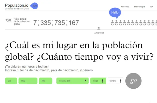 ¿Qué sucede cuando cruzamos tres variables distintas con los datos de la Organización Mundial de la Salud? http://www.population.io/ ¿Qué es Population.io? El lugar donde, a partir de ahora mismo, puedes descubrir la fecha exacta de tu muerte. Yo lo he hecho, y he descubierto con alivio que, si todo va según lo previsto, mi hora final tendrá lugar el 29 de julio de 2076. Me restan más de 61 años de vida por delante. Un segundo, ¿pero esto es exacto? Claro que no. Veamos por qué es interesante. Ante todo, Population.io es una herramienta útil para familiarizarnos tanto con la demografía actual del mundo como con la de nuestro propio país. El proyecto surge de la mano de Wolfgang Fengler (economista del Banco Mundial), K.C. Samir y Benedikt Groß. Junto a ellos colaboran el Grupo de Datos del Banco Mundial, la IIASA, y un puñado de técnicos y expertos en la materia que han contribuido a levantar la web recopilando y recopilando centenares de datos. ¿Cómo funciona? Muy fácil, sólo tenemos que introducir nuestra fecha de nacimiento, nuestro país de nacimiento y nuestro género. A partir de ahí, todos lo demás nos los ofrecen ellos. Partiendo de mis datos (01/05/1997, Venezuela, Hombre), los resultados se ajustan a la esperanza de vida de Venezuela en función de mi género y, lógicamente, del día en el que nací. Population.io opta, primero, por situarte en el contexto demográfico del mundo. Por ejemplo, el 44% de la población mundial (unas 3.000 millones de personas) es más joven que yo. En Venezuela, la cosa cambia de forma notoria: sólo el 34% de los venezolanos tiene menos años que yo (unos 10.500.000 millones). ¿Cuánto viviría si fuera un angoleño de 1967? Casi al final nos encontramos con uno de los gráficos más interesantes. Se trata de uno interactivo en el que podemos ajustar los hipotéticos años que nos quedarían de vida si viviéramos en otro país o en otra época. Ahora mismo me quedan 59,1 años de vida por delante. Supongamos, por ejemplo, que mi esperanza de vida es la misma de un ciudadano egipcio en 1973. En vez de llegar a los 79 años, como es el caso actual, me quedaría en los 70. 9 años de diferencia. Me he ido hasta Angola en 1966 para descubrir cuánta vida me quedaría por delante si tuviera su esperanza de vida. Resultado: tan sólo 35,6 años, casi la mitad de lo que llevo vivido ya. Cualquier tiempo pasado fue mucho peor. Moriría tras cumplir los 60 años.