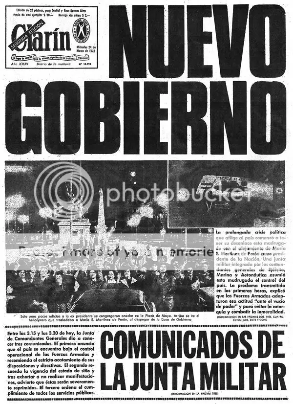24/03/1976 - Nuevo ¿Gobierno? 25/03/1976 - Fuerzas Armadas 26/03/1976 - Órgano Supremo 27/03/1976 - Asume Videla 28/03/1976 - Nuevo Gabinete 29/03/1976 - Videla jurará... (en nombre de Dios y de La Patria) 30/03/1976 - Videla y Ministros ya juraron 26/06/1978 - Campeones del Mundo 02/04/1982 - Malvinas 03/04/1982 - Malvinas 04/04/1982 - Malvinas 08/04/1982 - Malvinas 23/04/1982 - Malvinas 04/05/1982 - Malvinas 26/05/1982 - Malvinas 15/06/1982 - Malvinas 11/12/1983 - Asume Alfonsín SEGUINOS EN FACEBOOK