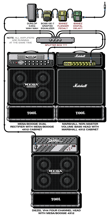 Bueno... cero ganas de escribir... si falta alguno me piden. Antes que nada los invito a conocer mi banda ADAM JONES - TOOL ROBERT FRIPP - KING CRIMSON OMAR RODRIGUEZ LOPEZ - THE MARS VOLTA JONNY GREENWOOD - RADIOHEAD PAUL GILBERT JOHN PETRUCCI - DREAM THEATER link: http://www.videos-star.com/watch.php?video=Ot-zal0DAu4&feature=player_embedded link: http://www.videos-star.com/watch.php?video=VQEG1HqCrnE&feature=player_embedded STEVE VAI JOE SATRIANI JOSH HOMME - QUEENS OF THE STONE AGE JOHN FRUSCIANTE - RED HOT CHILI PEPPERS JOE PERRY - AEROSMITH Guitars * Gibson Joe Perry Boneyard Les Paul's * Fender Stratocasters * Gibson ES-335 with Bigsby * Ampeg/Dan Armstrong Plexi Guitar (tuned to open A) * Guild 12-String Electric * Gretsch Black Falcon * Fender Reissue Telecaster * Ernie Ball/Music Man Silhouette 6 String Bass * Chandler Lap Steel * Gibson ES-335 (custom painted with his wife's face on body of guitar) * Gibson Firebird VII * Fender Telecaster w/B-Bender * Supro Ozark * Gibson Jeff Beck Les Paul Amplifiers * Marshall 50 Watt Plexi Head * Marshall Major 200 Watt Heads * Fender Tonemaster Head * Wizard 100 Watt Head * Marshall JMP-1 Preamp * Marshall 4x12 cabs * Vox 4x12 Cab * Orange 8x12 cab Effects and Accessories * Digitech Whammy Pedal * Dunlop DCR-1SR Rackmount Wah * Line 6 DL-4 Delay Modeler * Line 6 MM-4 Modulation Modeler * Klon Centaur * custom made Talk Box * Electro Harmonix Deluxe Memory Man * Chicago Iron Octavian * custom made Talk Box * Samson UR5-D Synth Wireless * Gibson Vintage Reissue .010-.046 Strings Es lo unico que consegui de el Bueno... les cuento, puedo poner informacion mucho mas copada, uno por uno los pedales, violas y equipos... pero como se dan las cosas en T! , donde ni agradecen aportes como este, voy a ver que respuesta tienen con este y despues veo si me tomo el trabajo de hacer mas exaustiva la cuestion... Saludos!