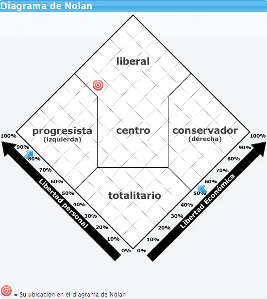 Contestando 20 preguntas sobre la sociedad que a uno le gustaría integrar, esta pagina te ubicara en el Diagrama de Nolan, un político estadounidense que desarrollo en 1969 un espectro mas amplio para definir la inclinación política de un individuo. Mas allá de la división entre izquierda y derecha, el diagrama tiene dos dimensiones: la social y la económica. El test es realmente sencillo y ayudara a ponerle un nombre a tus ideas políticas. Aqui el link: www.testpolitico.com Este es mi resultado: Ustedes ¿En donde quedaron ubicados?