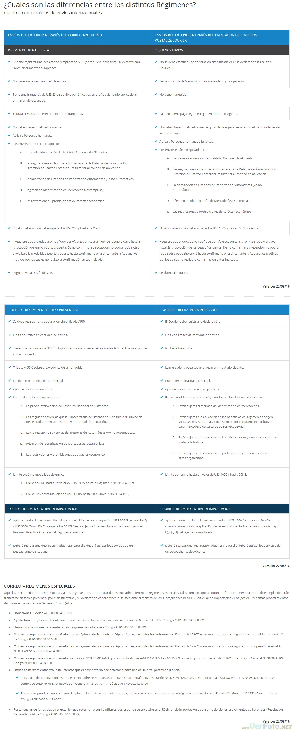 Como muchos ya sabe, AFIP habilito las compras de productos en el exterior, para ello, existe características y requisitos del Puerta a Puerta estipulado por AFIP: link: https://www.youtube.com/watch?v=GigQeR-nm08&feature=youtu.be Básicamente existen 3 metodologías: Puerta a puerta (Correo Argentino)Régimen General de ImportacionesPequeños envíos (Courier) Puerta a puerta (Correo Argentino) Régimen para compras de mercaderías que no superen los 2 kg, y además de que su valor no sea superior a U$S 200. Pequeños envíos (Courier) Régimen para compras de mercaderías que no superen los 50 kg, su valor no sea mayor a U$S 1.000, conformados por hasta 3 unidades de la misma especie y no presumir finalidad comercial. Régimen General de Importaciones Régimen para envíos que tienen finalidad comercial o su valor sea superior a U$S 999 (envío no EMS) / U$S 3.000 (envío EMS) o superen los 20 kg o que lo excluyan de los otros 2 regímenes. En ultimo lugar les quiero compartir la cuenta de Twitter oficial de AFIP: https://twitter.com/AFIPcomunica, resulta util para informarse sobre estos temas