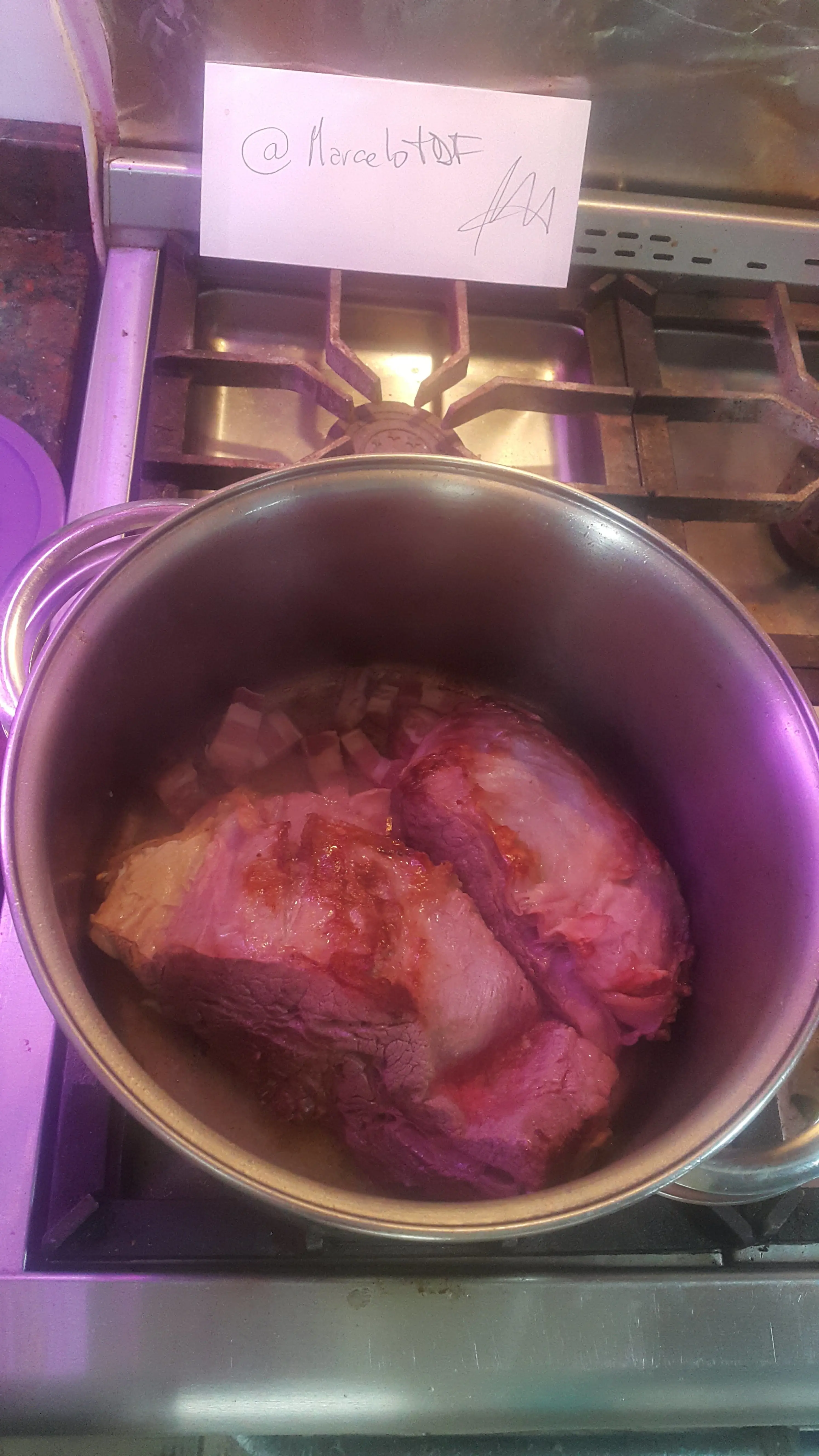 sellar la carne la mise en place de todas las verduras colocar las cebollas y el ajo colocar el resto de verduras y 500ml de caldo dsp de 90 minutos servir