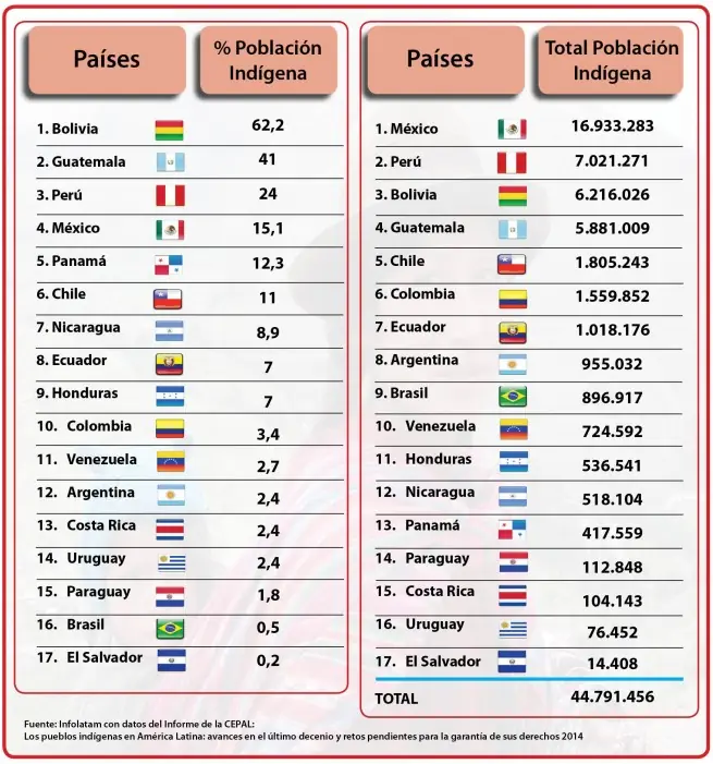 México es con diferencia el país que cuenta con mayor población indígena en la región latinoamericana, aunque Bolivia alberga el mayor porcentaje de población étnica. Ambos países disponen también del mayor número de programas y políticas públicas destinados a esta población, según el ranking de Infolatam, elaborado con datos de la CEPAL a los que ha tenido acceso Infolatam. Chile y Perú contabilizan el mayor número de conflictos mineros. Así se desprende del informe de la Comisión Económica para América Latina y el Caribe (CEPAL), “Los pueblos indígenas en América Latina: avances en el último decenio y retos pendientes para la garantía de sus derechos”, cuya síntesis fue presentada en la Conferencia Mundial de Pueblos Indígenas (CMPI), celebrada en Nueva York el pasado mes de septiembre. Infolatam ha tenido acceso al informe completo, aún no publicado, y con sus datos detallados ha podido elaborar diferentes rankings. En América Latina, como se examina en este estudio (también en su síntesis), existen más de 800 pueblos indígenas, con una población cercana a los 45 millones (que supone alrededor del 8% de la población total), que se caracteriza por su amplia diversidad demográfica, social, territorial y política, desde pueblos en aislamiento voluntario hasta su presencia en grandes asentamientos urbanos. Como se puede ver en el gráfico, los datos arrojan una gran heterogeneidad entre los países latinoamericanos. En México, pese a que la población indígena signifique poco más del 15% de la población total, vive la mayor población indígena de la región, en términos absolutos: cerca de 17 millones de personas. Le sigue Perú, con poco más de 7 millones, Bolivia (6,2), Guatemala (5,8), Chile (1,8), Colombia (1,5), así como Ecuador, Argentina y Brasil, cuya población indígena se sitúa alrededor del millón de personas. Y al final de la lista se ubica El Salvador, con poco más de 14 mil habitantes, precedido por Uruguay, Costa Rica y Paraguay, cuyas poblaciones indígenas rondan las 100 mil personas. En cuanto a los porcentajes de población indígena por países, en dos de ellos, Bolivia y Guatemala, los indígenas rondan casi la mitad de la población aunque, en Bolivia, superan el 60%. En tanto que en El Salvador y Brasil, la población étnica no supera el medio punto porcentual. Así las cosas, cabe preguntarse cuál es la situación de esta población en términos de reconocimiento de sus derechos, bienestar y respeto de sus identidades. Políticas públicas Si bien la situación de los indígenas en la región, como demuestra el reciente informe de la CEPAL en diversos indicadores, ha experimentado, a diferentes velocidades y con rasgos heterogéneos según los países, significativos progresos en su desarrollo económico y social, todavía hay muchos indígenas con pies descalzos, estómagos vacíos, sin escuelas, sin centros de salud, sin trabajo, sin tierras, sin techo digno y con limitada esperanza de vida. Sumando el número de programas y políticas públicas destinadas a la educación y a la salud de la población indígena, resumidas en el documento de la CEPAL, podemos observar que encabezan el listado México, Bolivia, Brasil y Ecuador. Es llamativo que el mayor número de programas y políticas se refieren a la educación y la lengua, mientras que en materia de salud, el monto de éstas se reduce significativamente. En el ámbito educativo, las políticas y programas se orientan mayoritariamente a la educación primaria y secundaria. Si se considera el ámbito de la educación superior y la formación de especialistas en educación intercultural —uno de los mayores déficits que se observan en la región—, solo en 11 países existen programas de formación superior en esta materia. Bolivia es de los pocos países que cuenta con varios programas de educación superior y es el país en el cual se puede observar una mayor presencia de la temática de la educación intercultural en el conjunto del sistema educativo y en las políticas públicas. Con respecto al derecho a la salud, en la región se ha promovido el enfoque de salud intercultural con el fin de que los servicios de salud resulten accesibles a los pueblos indígenas. La mayoría de los países de la región ha desarrollado legislaciones que presentan diferentes enfoques, énfasis y particularidades que van desde el reconocimiento del derecho a la salud como bien individual, mencionando a los pueblos indígenas como grupos prioritarios, hasta algunas que reconocen y promueven los derechos colectivos y las medicinas tradicionales. Sin embargo también existen planes que incluyen, de manera integral, los asuntos de salud junto con el territorio, la educación y la cultura, la economía y la producción, el desarrollo institucional, la organización y resolución de conflictos. Pese a todo, como sostiene Marcos Matías Alonso, el exmiembro del Foro Permanente para las Cuestiones Indígenas de la ONU, “la capacidad de respuesta institucional y el diseño de la política pública para los pueblos indígenas nos llevan al tema del presupuesto público”. Para Alonso, los presupuestos nacionales reflejan las prioridades gubernamentales sobre los diversos sectores sociales de cada país y expresan relaciones de poder y el grado de exclusión en cada una de las naciones. “En América Latina, solo México, Chile y Ecuador disponen de información financiera referente a la política pública para pueblos indígenas. En la mayoría de los países es complicado determinar el monto del presupuesto público asignado a los pueblos indígenas. Sin temor a equivocarme, puedo afirmar que son montos ínfimos”, afirma el investigador. Según un estudio comparativo de Ángela Meentzen, titulado: “Políticas Públicas para los Pueblos Indígenas en América Latina” y publicado por la Fundación Konrad en 2007, “México es el único país del estudio que cuenta con pol