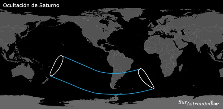 En escasos minutos, se dara paso a un evento astronomico muy lindo de observar. Es una ocultacion de Saturno por la Luna. Una ocultación lunar es un evento en donde la Luna, observada desde ciertas áreas concretas de la Tierra, pasa sobre otro cuerpo celeste (una estrella o un planeta, por ejemplo). En otras palabras, el objeto ocultado, la Luna y el observador estarán alineados. En esta oportunidad la Luna estará pasando sobre el planeta Saturno, ocultándolo para la región del sur de América y parte del Pacífico, en la noche del 7 de Julio (de la noche que va del 7 al 8 de Julio) El siguiente mapa muestra la zona en donde la ocultación de Saturno será observable. Todas las ubicaciones dentro del área marcada podrán observar la ocultación. La hora exacta del comienzo y final de la ocultación, así como el punto del disco lunar donde comenzará y terminará la ocultación, dependerá de la ubicación del observador. El siguiente listado muestra los horarios para varios puntos seleccionados de la región. Las horas se encuentran mostradas en Tiempo Universal (UT), para pasar de Tiempo Universal a hora local debe utilizarse el Huso Horario de la región. Tener en cuenta que el evento es en la noche que va del 7 al 8 de Julio. Un listado mas completo, con mas ciudades y datos adicionales, puede encontrarse aquí. El siguiente gráfico muestra la situación de la Luna y Saturno momentos antes de la ocultación, observando desde Buenos Aires. La ocultación comenzará en el borde no iluminado de la Luna y terminará con el planeta reapareciendo desde el limbo iluminado.
