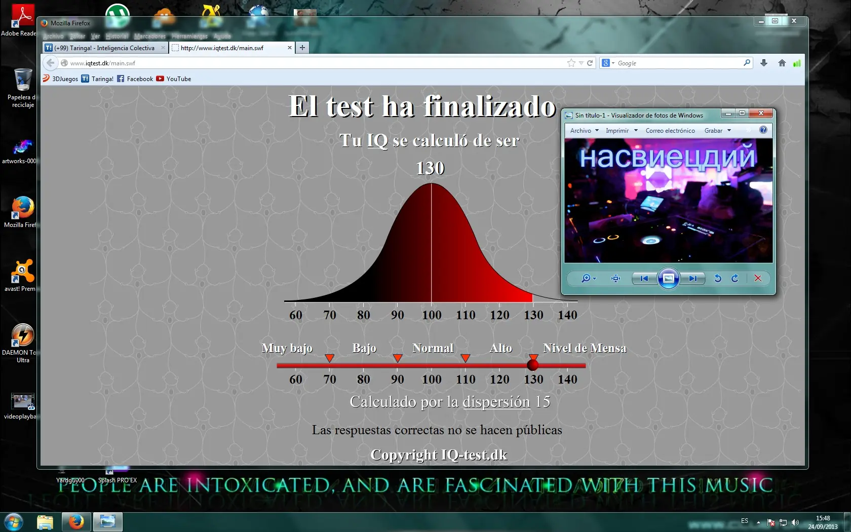 Hola a todos, les traigo esta página para que examinen su nivel de IQ, sabemos que por más que tengas un IQ alto no quiere decir que puedas inventar algo o sacar una teoría de yo que se (relatividad, big bang, etc),la inteligencia es la capacidad del humano para superar problemas. Cuando digo problemas, puede ser de cualquier tipo, matematicos, de habilidad fisica (reacción), cualquier pero cualquier tipo de circunstancias que se presenten. En este caso el test es geométrico, pero sabemos que hay gente para todo, uno puede ser brillante con las computadoras, otro con las pinturas (imaginar y recrear algo evitando fracasar)... etc. http://www.iqtest.dk/main.swf Aca está mi test, y si tienen ganas intentenlo y muestren el suyo.