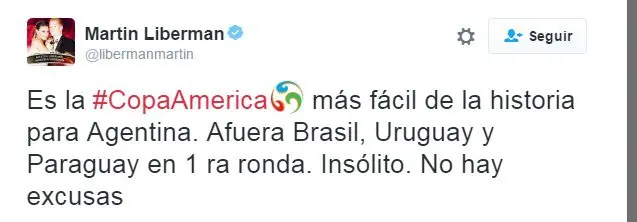 BIENVENIDOS Después de la eliminación de Brazil por Perú en la copa América Centenario. El periodista deportivo argentino Martín Alejandro Liberman, publico en twitter un comentario diciendo que Argentina tiene la copa regala. Gracias la puta que te pario, colorado del orto. ¿Que piensan? Tendremos lincharlo después de esto?
