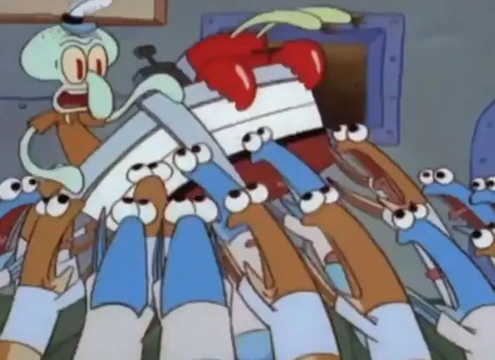 Porque te bañabas en plata mientras el mundo pasaba hambre. GIF Por que en dos segundos con unas cangreburgers te mandabas una pizza. (Esto le gana al alto guiso) Porque al igaul que al McDonnals, te hicieron un piquete en el Crustáceo Cascarudo. Porque preguntabas si salía positivo. Porque te drogabas y quedabas re duro. Porque tenías el culo depilado y brilloso. Porque tenías levante. Porque tus ojos eran multiuso. Porque con Bob quisieron ocultar el supuesto cadáver del inspector sanitario. Porque te pasabas la guita por las bolas y no te importaba nada. Porque te cabía el trasvestismo. Porque tenías la prodigiosa habilidad de tocar el violín más pequeño del mundo. Porque saliste del closet y abusabas de tus empleados. Y dejabas que abusen de vos. Porque estuviste cerca de quedar para The Walking Dead. Porque te quedabas en la compu hasta muy tarde. Porque tus empleados te ataron y te fajaron. Y los obligaste a trabajo esclavo por el resto de su vida. Porque profanaste la tumba de Smity Werben Yegger Man Jensen por una gorra que no valía un carajo. Porque eras alto abusador de menores. Porque siendo en crustáceo tenía una hija cetáceo. Porque te quedaste poseído. Porque te pintaba el bajón. Porque escuchabas música con auriculares estando debajo del agua. Porque te mandabas la carne podrida de todas maneras. Porque estás lleno de arrugas. Porque le afanaste la chabomba a tu vieja. Por esto y por mucho más te banco, a pesar de que seas judío. (Sino no me explico porque sos tan tacaño) Gracias por tanto Don Cangrejo, perdón por tan poco.