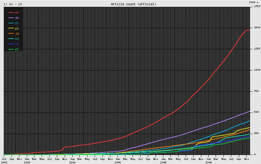 Wikipedia es una enciclopedia libre plurilingüe basada en la tecnología wiki. Wikipedia se escribe de forma colaborativa por voluntarios, permitiendo que la gran mayoría de los artículos sean modificados por cualquier persona con acceso mediante un navegador web. El proyecto comenzó el 15 de enero de 2001, fundada por Jimbo Wales y Larry Sanger como complemento de la enciclopedia escrita por expertos Nupedia. Ahora depende de la fundación sin ánimo de lucro Wikimedia Foundation. Wikipedia tiene más de 8 millones de artículos, incluyendo más de 2 millones en su edición en inglés, y a finales de febrero de 2006 alcanzó la cifra de 1.000.000 de usuarios registrados. Desde su concepción, Wikipedia no sólo ha ganado en popularidad sino que su éxito ha propiciado la aparición de proyectos hermanos. Existe, sin embargo, controversia sobre su fiabilidad. En este sentido, la revista científica Nature declaró a la Wikipedia en inglés casi tan exacta como la enciclopedia Britannica en artículos científicos. Los medios de comunicación y la comunidad científica citan a Wikipedia, algunas veces de manera crítica, otras ensalzándola por su carácter de libre distribución, mejora constante, y multifacética, no sin mencionar su naturaleza plurilingüe. A menudo no es citada como fuente única, sino como fuente informativa complementaria. Actualmente Wikipedia tiene ediciones en más de 253 idiomas , pero solamente 137 están activas (mayo de 2006). Catorce ediciones superan los 100.000 artículos: inglés, alemán, francés, japonés, polaco, italiano, sueco, holandés, portugués, español, chino, ruso, finés y noruego. La versión en alemán ha sido distribuida en DVD-ROM, y se tiene la intención de hacer una versión inglesa en DVD y en papel. Muchas de sus otras ediciones han sido replicadas a través de Internet (mediante «espejos») o se han creado enciclopedias derivadas (bifurcaciones) en otros sitios web. La palabra Wikipedia se construyó a partir de: Wiki, que proviene de wiki wiki, rápido en hawaiano, pedia, que proviene de paideia, (παίδεια), educación en griego clásico. El lema de Wikipedia es «La enciclopedia libre que todos podemos editar», y el proyecto es descrito por su cofundador Jimmy Wales como «un esfuerzo para crear y distribuir una enciclopedia libre, de la más alta calidad posible, a cada persona del planeta, en su idioma», para lograr «un mundo en el que cada persona del planeta tenga acceso libre a la suma de todo el saber de la humanidad».Es desarrollada en el sitio web Wikipedia.org haciendo uso de un software wiki, término originalmente usado para el WikiWikiWeb. Gales pretende que Wikipedia alcance a «la Britannica o la supere» en calidad y se lleve a formato impreso. Existen tres características esenciales del proyecto Wikipedia que definen conjuntamente su función en la web: Es una enciclopedia, entendida como soporte que permite la recopilación, el almacenamiento y la transmisión de la información de forma estructurada. Es un wiki, por lo que, con pequeñas excepciones, puede ser editada por cualquiera. Es de contenido abierto y utiliza la licencia GFDL. Existen o han existido muchos otros proyectos de enciclopedia en Internet, sin embargo ninguno ha contado con el éxito de Wikipedia. Se han usado políticas editoriales tradicionales y de autoría de artículos, como la «escritura-por-expertos» en la Stanford Encyclopedia of Philosophy y la ahora abandonada Nupedia. Ocasionalmente se encuentran sitios web como h2g2 o Everything2 que siguen unas pautas generales, y los artículos son redactados y controlados por personas individualmente. Proyectos como Wikipedia, Susning.nu, y la Enciclopedia Libre son wikis en los que los artículos son desarrollados por numerosos autores, y no existe un criterio de revisión formal. Wikipedia es la enciclopedia más grande en cuanto a número de artículos o palabras jamás escrita. Al contrario que muchas otras, su contenido se libera bajo la licencia GFDL. Wikipedia dispone de un conjunto de políticas que decide qué información se debe incluir o no. Estas políticas se utilizan para resolver disputas sobre añadir, revisar, transferir a un proyecto hermano, o borrar artículos. Crecimiento de Wikipedia Por Idiomas En mayo de 2006, Wikipedia englobaba 137 ediciones «activas» en distintos idiomas. Las cinco ediciones con más artículos son, en orden descendente, inglés, alemán, francés, polaco y japonés. En total, Wikipedia contiene 229 ediciones de idiomas en varios estados, que suman 3,8 millones de artículos. Cada edición trabaja de forma independiente. Las ediciones no están obligadas a poseer el contenido de ediciones en otros idiomas, y sólo deben respetar políticas globales como mantener un «punto de vista neutral». Sin embargo, algunos artículos e imágenes se comparten entre las diversas ediciones de Wikipedia, solicitando traducciones organizadas de artículos de ediciones en otros idiomas, o a través del repositorio de Wikimedia Commons. Los artículos traducidos sólo representan una pequeña parte de los artículos de cualquier edición. La siguiente es una lista de las quince mayores ediciones, ordenadas por número de artículos y por tamaño en megabytes y gigabytes ; las cifras de artículos son actuales, los tamaños de las bases de datos son de abril de 2007 (excepto la inglesa, que data de septiembre de 2006): Las ediciones con mayor número de artículos: Inglés (2.098.904 artículos) Alemán (668.274 artículos) Francés (585.469 artículos) Polaco (443.677 artículos) Japonés (438.302 artículos) Holandés (381.001 artículos) Italiano (375.322 artículos) Portugués (340.497 artículos) Español (302.885 artículos) Sueco (261.774 artículos) Ruso (215.487 artículos) Chino (154.199 artículos) Finés (140.574 artículos) Noruego (140.683 artículos) Esperanto (91.264 artículos) Inglés (4,4 gigabytes) Alemán (2,1 gigabytes) Franc