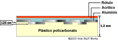 CD Los CDs almacenan música y otros archivos en forma digital, esto es, la información en el disco es representada por una serie de unos y ceros. En los discos convencionales, estos 1s y 0s son representados por millones de diminutas áreas abolladas y planas en la superficie reflejante del disco. Las abolladuras y zonas planas son alineadas en una pista continua que mide alrededor de 0.5 micras (millonesima parte de un metro) de ancho y 5km de largo. Para leer esta información, el CD player pasa un rayo láser por encima de la pista. cuando el láser pasa sobre una superficie plana en la pista, el láser es reflejado directamente hacia un sensor óptico que se encuentra en el ensamblado láser. El CD player interpreta esto como un 1. Cuando el láser pasa sobre un hoyo, el haz de luz es rebotado fuera del sensor óptico. El CD player reconoce esto como un 0. Los hoyos son arreglados en un camino en espiral, empezando por el centro del disco. El lector de CD gira el disco, mientras el láser se mueve hacia afuera del disco empezando del medio. Para mantener el escaneo de datos a una velocidad constante, el lector debe disminuir la velocidad mientras el láser se mueve hacia afuera, debido a que los hoyos se mueven a lo largo de cualquier punto del margen exterior mas rápido que cuando se mueven en cualquier punto cercano al centro del CD. Esto lo podemos apreciar en la siguiente figura. Así es como funciona básicamente un lector de CD. La ejecución de esta idea es bastante complicada, porque el formato del espiral debe ser codificado y leído con una precisión increíble, pero el proceso básico es bastante sencillo. La maquina fabricadora de CD usa un potente láser para grabar la estructura de abolladuras dentro de un material fotoresistivo revestido sobre una lamino de cristal. A través de un elaborado proceso de impresión, esta estructura es presionada sobre discos de acrílico. A los discos se les aplica entonces un recubrimiento de aluminio (u otro metal) para crear la superficie reflejante legible. Finalmente, el disco es es cubierto con una capa transparente de plástico, la cual protege el metal reflejante de picaduras, raspones y basura. Como puedes ver, esta es una delicada operación bastante complicada, que envuelve muchos pasos y varios materiales distintos. Como la mayoría de los complejos procesos industriales, la manufactura de CDs convencionales es prácticamente imposible hacerse en casa. Es solo factible para fabricantes quienes producen cientos, miles o millones de copias de CDs. Por consiguiente, los CDs convencionales han permanecido como un medio de almacenamiento de "solo lectura" para el consumidor promedio, como los LPs o los DVDs. Para los aficionados a la música acostumbrados a los casetes grabables, así como también los usuarios de computadoras para quienes la limitada capacidad de memoria de los discos flexibles era insuficiente, esta limitación parecía como un incoveniente muy grande de la tecnología del CD. A principios de los 90s, mas y mas consumidores y profesionales buscaban una forma de hacer sus propias grabaciones con calidad digital de CD. En respuesta a esta demanda, los fabricantes de electrónica introdujeron una alternativa clase de CD el cual podría ser codificado en pocos pasos. Los discos Grabables, o CD-Rs, EL CD-R Los discos Grabables, o CD-Rs, los cuales no tienen ningún hoyo u área plana (datos). En lugar de eso, estos tienen una capa fina metálica reflejante, la cual reposa en la parte superior de una capa de color fotosensitivo. Cuando el disco está en blanco, el color es traslúcido: el color puede brillar a través y reflejarse fuera de la superficie de metal. Pero cuando se calienta la capa de color con luz concentrada, de una particular frecuencia e intensidad, el color se torna opaco: Este se oscurece al punto de que la luz ya no puede pasar de un lado a otro. Al oscurecer puntos selectivos a lo largo de la pista del CD, y dejando otras áreas con el color transluciente, tu puedes crear un patrón digital que un lector estándar de CD puede leer. La luz del láser del lector solamente rebotará al sensor cuando el color sea transparente, de la misma forma que rebota con las áreas lisas de los CDs convencionales. Entonces, a pesar de que el CD-R no posee ningún hoyo en el, este se comporta exactamente igual que el disco estándar. El trabajo de un quemador de CD es "quemar" el patrón digital sobre el CD en blanco. Debido a que la información debe ser codificada con mucha precisión, a una escala tan pequeña, el sistema de quemado debe ser extremamente preciso. Aun así, el proceso básico en funcionamiento es bastante simple. FUNCIONAMIENTO DEL DISPOSITIVO QUEMADOR El quemador de CD tiene ensamblado un láser movible, igual que un lector de CD ordinario. Pero en adición al "láser lector" estándar, este tiene un "láser escritor". El láser escritor es mas poderoso que el láser lector, entonces este interactúa con el disco de forma distinta: Este altera la superficie en lugar de solo rebotar la luz en esta. Los láser lectores no son suficientemente intensos para oscurecer el material de color, por lo tanto simplemente tocando un CD-R en un lector de CD, no se destruirá ninguna información codificada. El láser escritor se mueve exactamente de las misma forma que el láser lector: Este se mueve hacia afuera mientras el disco gira. La capa inferior de plástico tiene surcos pre-impresos dentro de esta, para guiar el láser a lo largo del camino correcto. Calibrando velocidad de giro con el movimiento del ensamblaje del láser, el quemador mantiene el láser corriendo a lo largo de la pista a una velocidad constante. Para grabar la información, el quemador simplemente activa o desactiva el láser escritor en sincronía con el patrón de 1s y 0s. El láser oscurece el material para codificar un 0 y lo deja transparente para codificar un 1. El mecanismo del quemador de CD es muy parecido al mecanismo 