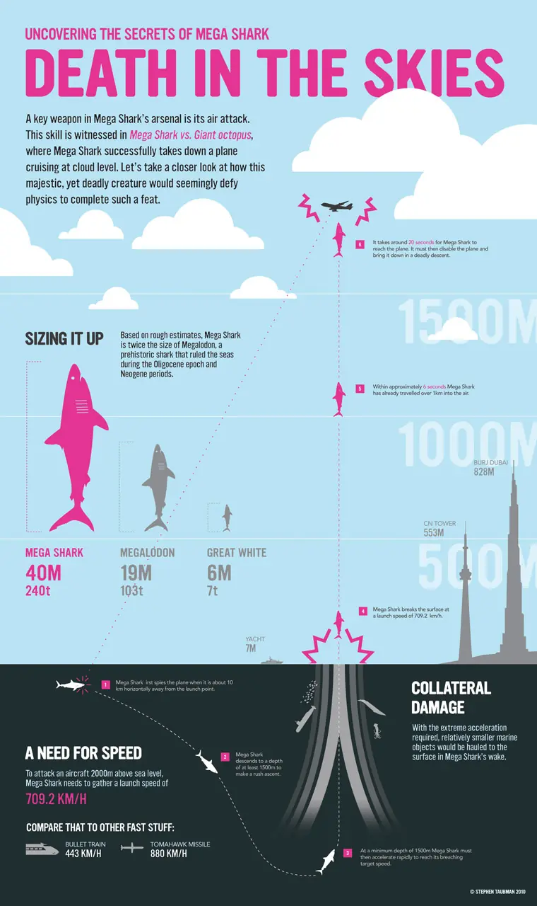 Si alguno de vosotros vio el tráiler de la película Megashark vs Giant Octopus tendrá tan grabada como yo la famosa escena en la que el supertiburón pega un brinco y atrapa un avión comercial entre sus fauces. Al infografista Stephen Taubman la escena le pareció tan friqui y disparatada como a nosotros y decidió recrear las condiciones de la hazaña en un gráfico delirante: Para realizar el gráfico, Taubman consultó con un amigo físico y reprodujo los siguientes cálculos. De acuerdo con lo que vemos en la película, el megatiburón mide alrededor de 40 metros (el doble de grande que el mítico Megalodon y casi siete veces mayor que el tiburón blanco) y pesa 240 toneladas. Suponiendo que el avión vuele a una altura de unos 2.000 metros (estaría cerca del aeropuerto), el tiburón necesita alcanzar una velocidad de lanzamiento de unos 700 km/h, comparable casi con la velocidad de un misil de crucero. Graba tus videos en con la Zx1 link: http://www.videos-star.com/watch.php?video=I16_8l0yS-g Para ello, necesitaría detectar el avión a una distancia de 10 kilómetros, descender a una profundidad de 1.500 metros y ascender hasta adquirir la velocidad crítica de despegue. A unos 700 km/h, el tiburón debería ascender durante 10 segundos para alcanzar el avión y descender con él entre los dientres desde semejante altura. Un prodigio de agudeza visual, puntería, fuerza y capacidad de vuelo. La respuesta a la pregunta de esta entrada es, obviamente, ¡NO!, pero el ejercicio de Taubman es tan descacharrante como entretenido.
