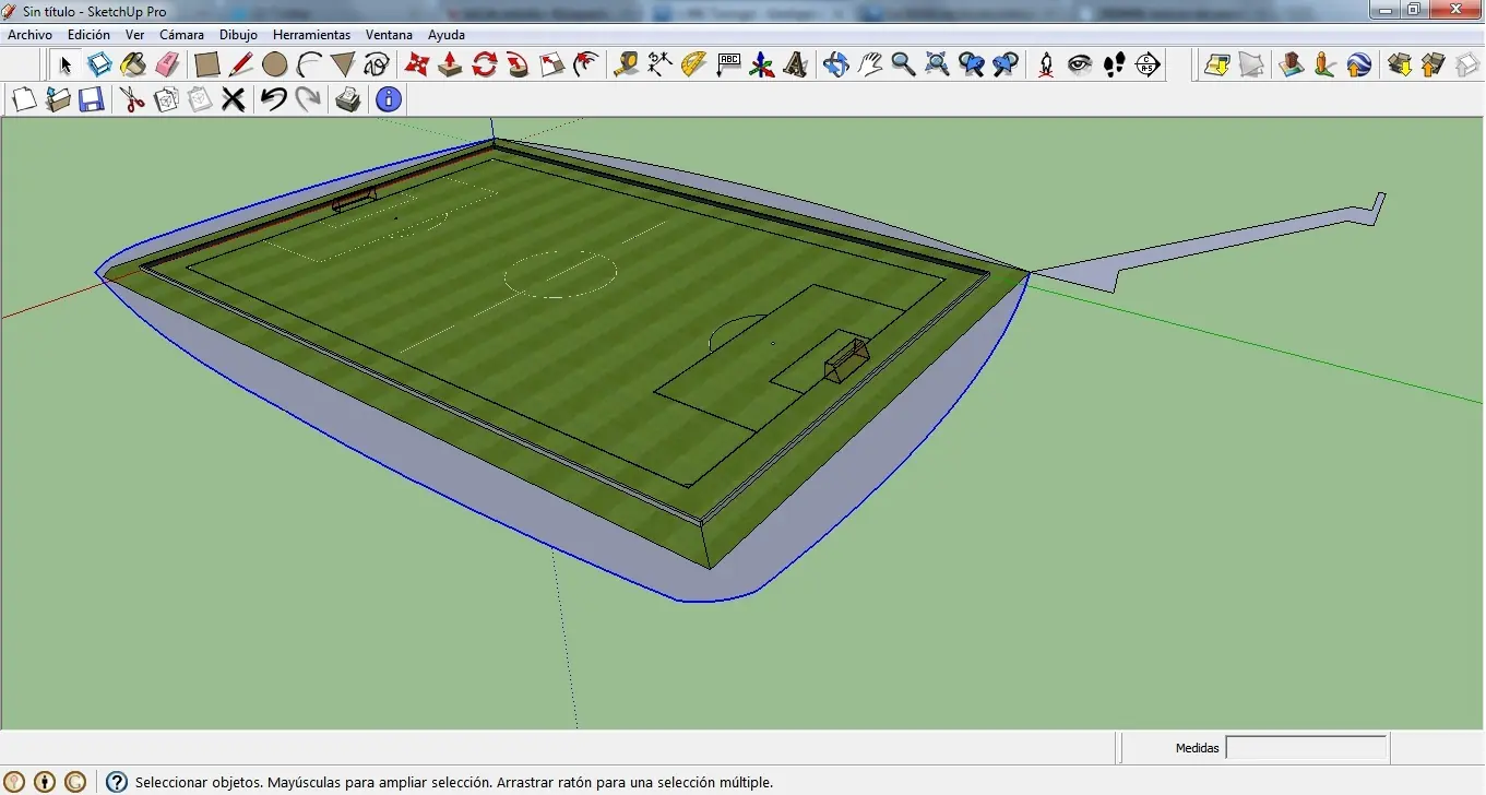 Buenas gente de taringa. hoy les voy a enseñar a como hacer un estadio en google sketchup, es bastante facil y queda muy bien. Primero abrimos el Google sketchup, y seleccionamos la plantilla metros, yo ya lo tengo listo cuando abre. Despues, conseguimos un campo, asi nos ahorramos el trabajo de hacerlo (yo ya tengo uno hecho por mi) Agrandamos un poco el campo con la herramienta equidistancia y le hacemos pantallas LED. Para hacerlas con la herramienta rectangulo haces click en la punta de la linea que creamos con la herramienta equidistancia, las medidas tienen que ser 1,5 ; largo de la linea. Luego el rectangulo pintamos con Metal- Metal en Relieve (yo lo pintare luego) y lo levantamos a una altura de 70cm con la herramienta empujar/tirar. Para hacer la textura a los LED, utilizaremos esta imagen La descargas. Luego vas a pintar, pintas la superficie que iría con esa textura, vuelves a pintar y pones editar, luego donde dice "textura" haces click en examinar y busca la imagen que di anteriormente. Ahora empezaremos a hacer las tribunas. Primero Hacemos la forma que seguiran las tribunas y luego la forma de la tribuna. Te recomiendo que te guies con la medida, porque si queda muy grande queda muy mal. Luego seleccionamos los bordes que seguira esa tribuna Luego con la herramienta seguir clickeamos la cara de la tribuna y automaticamente quedara la tribuna: Yo queria una tribuna techada diferente por eso deje ese espacio libre Así me va quedando: Bueno ahora hay que hacerle detalles, puertas de entrada, vallas, palcos, esto haganlo como quieran, terminado me quedo así: Otros Modelos: Espero que les haya gustado y que les haya servido! Nos vemos!