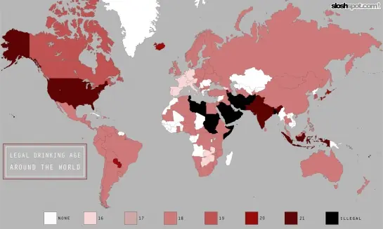 Al parecer todo el mundo en los EE.UU. se queja de la edad legal para Beber , que se fijó en 21 años, la protesta se hizo con el argumento de que si tienes la edad suficiente para luchar en una guerra por tú país, también deberías ser capaz de disfrutar una cerveza legalmente. No es un mal argumento , pero podría ser peor. El servicio militar puede ser obligatorio, y la bebida puede ser ilegal. El siguiente mapa muestra la edad legal para beber en cada país alrededor del mundo. -En algunos países, la edad que legalmente puedes tomar es diferente a la edad en que legalmente se puede comprar alcohol.Algunos son diferentes en sustancia y materia entre tipos de alcohol, la diferencia suele estar alrededor de 22% ABV -No todas las leyes se hacen cumplir a raja tablas, muchos países siguen la costumbre general de cada lugar. -Muchos países de Oriente Medio tienen la prohibición de alcohol bajo la ley musulmana, aunque el país permite que determinados establecimientos puedan venden a los turistas con la obtención de una licencia adecuada. - En Canadá la edad legal para consumir alcohol varía según el estado, Alberta, Manitoba y Quebec todas se ajustan a la edad de 18 años, el resto a 19 años. -La edad legal para beber en Nepal es de 24 años. -La edad legal para beber alcohol en la India varía entre 18 y 25 años de un estado a otro. -LA edad legar para beber en Brasil es de 18 años,pero para votar en las elecciones presidenciales es de tan solo 16 años (es ridículo) ASI QUE YA SABES, PLANEA BIEN A DONDE VAS DE VACACIONES!!!