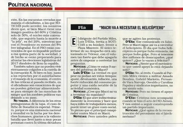 " Macri va a necesitar el helicóptero". Con esta frase, Luis D'Elía volvió a agitar viejos fantasmas que recuerdan los trágicos días de la salida de Fernando de la Rúa de la Casa Rosada. Además, los dichos del dirigente piquetero se dan en tiempos en que se vienen registrando movilizaciones de protesta contra el Gobierno. "El día que hubo helicóptero es porque hubo renuncia, no porque hubo golpe. Pero si tenemos dos millones de desocupados, ¿qué quiere?, ¿qué lo vayan a felicitar?", argumentó D'Elía en una entrevista publicada en la última edición de la revista Noticias. En la misma línea, el dirigente piquetero consideró que el Gobierno "abre indiscriminadamente la economía y hace que haya miles de trabajadores menos", lo que "puede tener un grave costo social". Y agregó: "Yo pienso que el principal conspirador contra Macri es Macri ". Por otro lado, el dirigente del partido Miles fue consultado sobre la posibilidad de que Cristina Kirchner vaya presa por las numerosas causas judiciales en su contra. D'Elía advirtió que si eso sucede, "va a haber un 17 de octubre " e hizo una comparación con lo ocurrido con Juan Domingo Perón en 1945. "Para nosotros sería una presa política. Bueno, alguna vez lo tocaron a Perón y hubo un 17 de octubre . Que la metan presa, no hay problema. pero va a haber un 17 de octubre , no tenga duda", concluyó. Fuente: