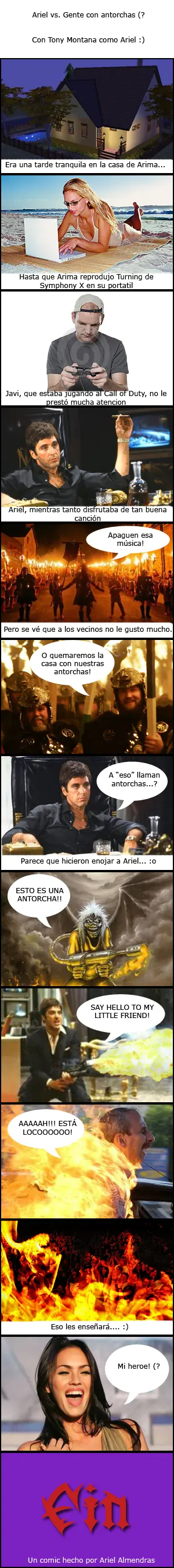 Una historieta que hice en base a una conversación de MSN con Arima, notese la diferencia horaria, ella vive en Canarias (España) y yo en Río Gallegos (Argentina). Allá eran la 1 de la mañana cuando le recomiendo una cancion de Progressive Metal por MSN. Esta es la conversacion Ariel dice: *Escuchá The Turning, de Symphony X Arima dice: *la tengoooo *X3 Ariel dice: *Escuchala X3 Arima dice: *está javi aquí al lao jugando a la play dah Ariel dice: *A que juega? Arima dice: *Call of duty Ariel dice: *Que no llore que la musica no le afecta (? xD Arima dice: *yo lo digo más bien por el jaleo que tiene montado y es la una de la mañana *si encima pongo música *los vecinos vienen con antorchas Si les tira algun error de hotlinking esta es el link de mi DA Cita :http://arielxax.deviantart.com/art/Ariel-vs-la-gente-con-Antorcha-132413097 Espero les guste xD