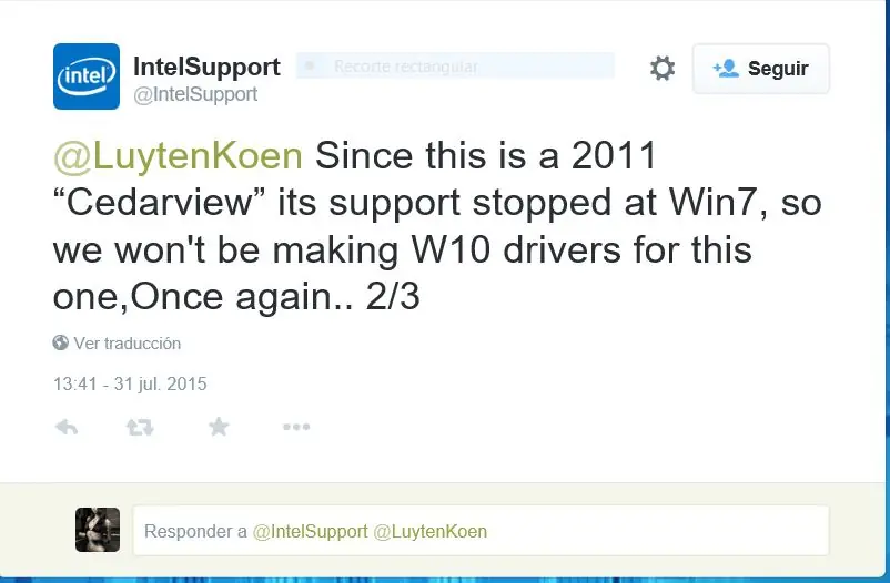 EDITADO: Ahora Intel dice que no sacara ningún driver para la tarjeta, cuando hasta ayer (30/7) dijo que sacaría driver incluso para la vieja GMA 3150. Post original: Los que tenemos esta tarjeta de video integrada incluida en algunos procesadores Atom, sabemos que su soporte no es para nada bueno, el único sistema operativo que soporta oficialmente es Windows 7, en el caso de Windows 8 se podía lograr usarlo pero con problemas en suspender el equipo y sin poder abrir apps Modern UI (Metro). La parte buena es que ayer como todos saben salió Windows 10 y hoy Intel anuncio ante preguntas por Twitter de que lanzara un driver compatible con el nuevo sistema operativo Esto probablemente también signifique muchísimas mejoras en el driver (como mejor rendimiento HTML5 y quizás hasta incluyan compatibilidad para Directx10 como se prometió en la salida de esta tarjeta) Capturas con la info: Aca se puede ver el post completo en Twitter: https://twitter.com/CristobalGCas/status/626684855527559168
