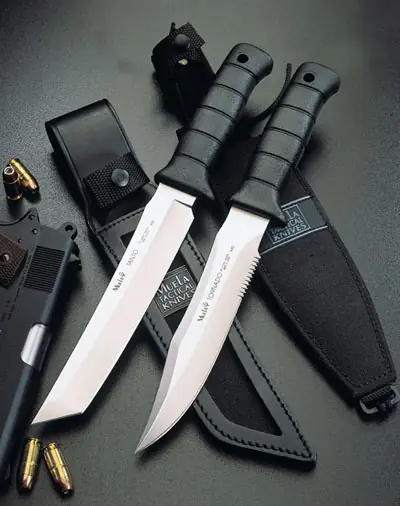 A lo largo de la historia se han llegado a conocer muchos pueblos y civilizaciones por su arte y características en la fabricación de cuchillos, como por ejemplo Kris malayo, Dirk escocés, Kukris del Nepal, Tantos japonés, etc. Con el descubrimiento del hierro los cuchillos o armas blancas empezaron ha ser resistentes y ha proporcionar filos más duraderos. Pero la fabricación de cuchillos y armas blancas ha cambiado y actualmente se utiliza el hierro junto con acero, acero inoxidable, acero al carbono, cromo, molibdeno, vanadio, etc. Aunque, hoy en día, hay una gran tendencia en la fabricación de armas blancas (como el cuchillo de defensa personal, etc.) en PVC material indetectable en los controles de metal, que sólo se puede detectar mediante chequeo. Un cuchillo es una pieza muy importante en la vida cotidiana como en situaciones de supervivencia, operaciones militares, defensa personal, cuando comemos y necesitamos cortar la comida, etc., lo que convierte al cuchillo en una herramienta polivalente. Pero resulta importante resaltar que en ciertas sociedades el llevar cierto tipo de cuchillo representa pertenecer a cierta Jerarquía Social. Existe una gran diferencia en las modalidades del cuchillo; los de hoja fija o las navajas. Los cuchillos de hoja fija son armas con filo, pudiendo tener uno o doble filo (sólo permitidos en armas blancas militares), son de estructura sólida desde la punta de la hoja hasta la empuñadura, es decir, no pueden doblarse. Las navajas se doblan en un punto específico, hay de múltiples variedades (mariposa, automáticas,...), pero en general se clasifican en multiusos y en tácticas. Las partes fundamentales de un cuchillo o arma blanca se dividen en: hoja, que es quizás la parte más importante del cuchillo, con diferentes formas y materiales, resistente pero con cierto grado de flexibilidad, con multitud de formas como la tipo Bowie, tipo japonés, de doble filo, de supervivencia, de combate, tipo Bolo y tipo Skinner (son las principales), dentro de la hoja del cuchillo hay otras partes como son la punta, el extremo de la misma, el filo y el contrafilo de la hoja. Guarda o protección es la pieza que separa la hoja de la empuñadura del cuchillo. Empuñadura es la parte por donde se agarra el cuchillo. El mejor cuchillo es el que resulta práctico, resistente, fácil de afilar y, sobretodo, el que se adapta al uso para el cual ha sido escogido. Si la elección es un cuchillo de combate se deben tener en cuenta ciertas características: su peso debe estar entre 400 y 550 gr.; la hoja del cuchillo debe ser de acero muy resistente (resistir una fuerte presión lateral sin romperse), el recubrimiento negro de algunas hojas de cuchillo es para protejerlas de sustancias corrosivas y para eliminar los reflejos no deseados; el punto de equilibrio de la hoja debe estar a unos 3 cms de la empuñadura del cuchillo; la punta de la hoja del cuchillo debe estar afilada y situada en el centro del eje de la empuñadura, a la vez que si es lisa permite una mejor penetración; el guardamanos debe ir estrechándose cuanto más cerca este de la hoja y debe ser lo suficientemente largo para que los dedos no toquen la hoja; la forma, dureza y el material de la empuñadura del cuchillo aseguran la ergonomía y el agarre, por eso se utiliza la madera u otro material que no se deslice cuando este frío o mojado y; por último, la funda dicta la accesibilidad del cuchillo y por eso debe ser muy funcional, fácil de quitar y silenciosa. El cuchillo de supervivencia se ha convertido en un objeto muy apreciado entre los círculos militares, pues necesitan un cuchillo fuerte, fiable, seguro y sin pesados detalles adicionales. Por eso, el cuchillo de supervivencia siempre ha sido asociado al uso militar, utilizado principalmente en casos de tratamiento y preparación de explosivos. El cuchillo de supervivencia también es utilizado en casos de localización, señalización y desactivación de minas y trampas explosivas, para la extracción de pólvora de la munición, para silenciamiento y eliminación de centinelas, en operaciones de infiltración, evasión y escape, como defensa para ataques de perros entrenados, como arma blanca para defenderse y atacar, etc. Como usos tácticos con el cuchillo se pueden destacar; el uso policial en las que un agente policial puede enfrentarse a situaciones donde necesitarán cuchillos para cortar diferentes materiales (ropas, lonas, cuerdas,...), para abrir puertas y ventanas, etc. Otra utilización puede producirse en situaciones de rescate, donde es imprescindible el tener un buen cuchillo o navaja, sobretodo con accesorios, porque no saben con lo que se pueden encontrar. Otra utilización del cuchillo o navaja se puede producir en situaciones de necesidad de primeros auxilios para cortar vendas, realizar torniquetes, etc. La manera más sencilla y mejor de cuidar un cuchillo en manteniéndolo limpio y seco. Cuando el cuchillo se ensucie debe lavarse bien con agua caliente y un poco de detergente, secándolo bien. No se debe engrasar o untar con aceite. Para lavar los cuchillos de cocina de aconseja lavarlos a mano y no en el lavavajillas. ¡Mantén el cuchillo afilado! Es muy importante mantener el cuchillo bien afilado porque si no lo está puede resbalar y causar graves daños. La mejor manera de afilar un cuchillo es por medio de un afilador de diamante fino y plano.
