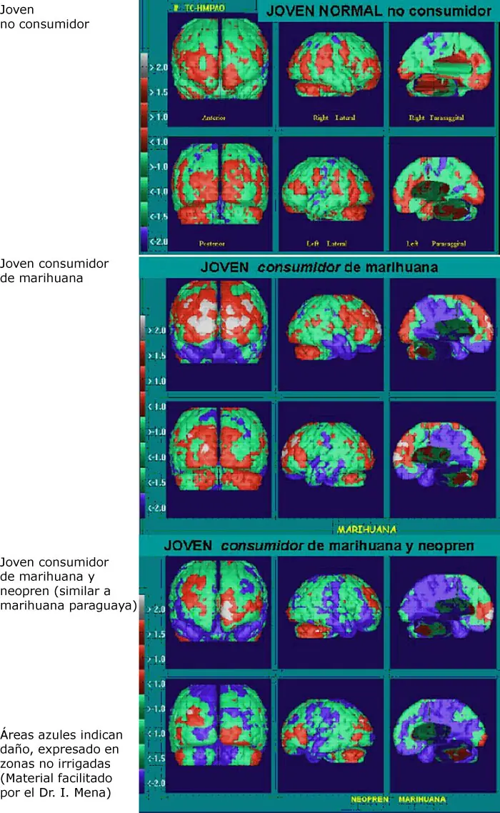 Efectos del consumo de marihuana en funciones cognitivas en adolescentes escolares. AJ43-1 Versión de impresión Dörr, Anneliese, PS. 1; Gorostegui, M. Elena, PS. [1,2]; Dörr, M.Paz B MD3; Sekler, Alejandra, PS. 4; Villacura, Leonor, PS.1; Flores, Patricia, PS.4; Sandra Viani, PS.1; Mena, Ismael, MD5 1 Universidad de Chile, Facultad de Medicina, Santiago de Chile. 2 Universidad Católica de Chile, Facultad de Psicología, Santiago de Chile. 3 Hospital Clínico, Universidad Católica de Chile, Santiago de Chile.. 4 Hospital del Salvador, Santiago de Chile. 5 Clínica Las Condes, Santiago de Chile. Correspondencia: Psichologist Anneliese Dörr: adorr@med.uchile.cl Cita/Reference: Dörr, Anneliese, Ps. et alt. Efectos del consumo de marihuana en funciones cognitivas en jóvenes adolescentes. Alasbimn Journal 11 (43): January 2009. Article N° AJ43-1. http://www.alasbimnjournal.cl/ Resumen El presente estudio explora el efecto de la marihuana en una población de jóvenes adolescentes escolares, que sólo consumen esta droga ilícita y no otra, y que jamás han consultado a un especialista por problemas de adicción. Los resultados muestran el efecto del consumo habitual de marihuana en funciones cognitivas involucradas en el aprendizaje. Una vez identificados los sujetos, se realizan evaluaciones individuales de estudiantes consumidores y no consumidores de educación media de establecimientos de dependencia municipal, particular subvencionada y particular pagada del Area Metropolitana (Santiago de Chile). Se evidencian efectos nocivos sobre la memoria inmediata, atención-concentración y estrategias de ejecución en los consumidores, con diferencias estadísticamente significativas respecto al grupo control. Se constata mayor consumo relativo en colegios pertenecientes a sectores marginales y escasa o inexistente percepción de daño asociado al consumo de la droga, especialmente entre los consumidores habituales. Las niñas tienden a igualar los niveles de consumo de los varones. Palabras claves: Cannabis, adolescentes, consumo, daño neurológico, funciones cognitivas Antecedentes El consumo de marihuana entre la juventud, no es un fenómeno propio de nuestros días. En los años 60, el consumo de marihuana era más o menos habitual entre jóvenes universitarios que se autodefinían como rebeldes o vanguardistas. No ocurría lo mismo en grupos escolares adolescentes, en que probablemente el alcohol y el tabaco eran la forma de parecer diferentes, de sentirse adultos y de desafiar el statu quo. Tanto en escolares adolescentes como en jóvenes universitarios, la proporción de hombres consumidores era mayor, situación que también hoy ha cambiado, al menos en Chile (3) Cincuenta años después, la situación ha variado sustancialmente: se sabe que el cannabis es la droga ilegal con más altos índices de consumo en el mundo y con un ritmo de crecimiento sostenido, a lo que se suma una disminución alarmante en la edad de inicio. Quizás sea esto último lo más preocupante desde la perspectiva de la salud pública, considerando que un inicio anterior a los 16 años tiene consecuencias más negativas que un inicio más tardío. (11 , 2) Representaciones sociales y percepción de riesgo Los grupos humanos constituyen sobre ellos mismos, los otros y los eventos que viven, explicaciones que si bien no son científicas, sí determinan las prácticas que regulan sus conductas (9) Se podría decir, que las representaciones que los jóvenes en particular y la sociedad en general tiene sobre el consumo de marihuana, influye en la decisión y/o en la mantención del consumo. En los 10 últimos años la percepción de riesgo asociada la consumo entre estudiantes secundarios, cae desde un 60% en 1994, a 36.9% en 2004, mientras su uso ocasional es considerado como inocuo, índice de buena onda y de ser relajado por la mayoría de los jóvenes. En el mismo estudio se destaca la relación entre alto consumo y baja percepción de riesgo (2) . Recientes estudios reportan que la percepción de peligro asociada al consumo esporádico (aprox. 1 vez al mes) es menor para la marihuana que para el consumo ocasional de algún sedante y más o menos equivalente al consumo moderado de alcohol. En Chile el riesgo percibido se mantiene bajo y con tendencia a descender. Se destaca también la asociación entre alto consumo y baja percepción de riesgo (3) Por otra parte, la introducción en el imaginario colectivo, de la idea de que la mariguana, lejos de ser nociva para la salud, tendría efectos medicinales (10) agrega elementos que validan su consumo indiscriminado, sin ninguna consideración de lo restringido que podría ser ese tipo de indicación médica en el caso de comprobarse. Edad de inicio como factor de riesgo La precocidad en el momento de inicio de consumo parece ser un factor de peso en el daño producido: el inicio antes de los 16 años provoca cambios neuropsicológicos más significativos que los producidos en inicios tardíos. Independientemente de efectos más o menos esperables tales como mayor consumo futuro tanto de cannabis como de otras drogas, unido a dificultades para suspender el consumo, preocupa la posible asociación con déficits neurológicos que en adolescente puede manifestarse como bajo rendimiento e incluso deserción escolar temprana. (11) Efectos del Cannabis (agudos) Se conocen alrededor de 60 sustancias cannabinoides específicas de la marihuana, siendo los principales por sus efectos psicoactivos el delta-9-tetrahidrocannabinol (THC) el cannabidiol y el cannabinol. Estas sustancias se unen a receptores específicos que se encuentran en las membranas de algunas células (muy distribuidas en el cerebro) y se acoplan a la proteína G como sistema de transducción. En relación a sus efectos sobre el aprendizaje, existen compuestos endógenos, los endocannabinoides, que se unen a los receptores, y que están implicados también en la memoria y otros procesos cognitivos. Adic