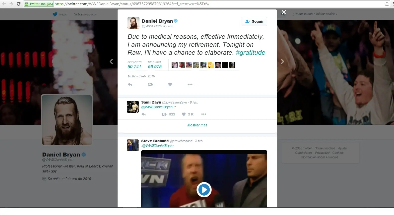 Bryan Lloyd Danielson, más conocido como Daniel Bryan, conmocionó a todo el mundo del wrestling en la tarde de ayer, al anunciar en su twitter que se retiraba. "Debido a problemas médicos, y desde este momento, anuncio mi retiro. Esta noche en el Raw, tendré mi oportunidad de explicarles", escribió Daniel Bryan en su cuenta de Twitter. Después de hacerlo en las redes sociales, salía a dar la cara durante las grabaciones de Raw , con un emotivo discurso en el que daba las gracias a todo el universo WWE , así como a su mujer y a algunos de los luchadores que más le han ayudado durante su etapa en la compañía. Anunciaba que tenía que pasar página; que su cerebro no estaba tan sano como él pensaba y que a partir de hoy cambiaría su vida y dejaría de ser luchador para dedicarse a su familia. El público asistente interrumpió varias veces el discurso con aplausos y gritos de agradecimiento. link: https://www.youtube.com/watch?v=6KzD06Wpofw Solo queda decir #ThankYouDanielBryan