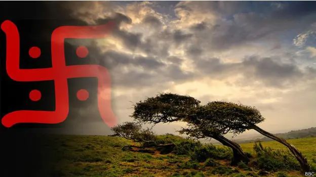 Esvástica. Es una palabra potente. Para más de 100.000 millones de hindúes significa bienestar y buena fortuna. Para otros, la cruz de ángulo recto será para siempre el símbolo del nazismo. Sin embargo, Reino Unido está inundado de esvásticas... ¿Por qué? La palabra proviene del sánscrito "svastika" que significa "bueno ser", no obstante la palabra -y quizás aún más el símbolo que la representa- muy a menudo se ha interpretado de una manera muy distinta. Piedra esvástica de West Yorkshire. Tanto que cuando un miembro del público recientemente le preguntó a la municipalidad de Essex, Reino Unido, porque habían permitido que se esculpieran esvásticas en su edificio de oficinas, hubo quienes exigieron que los retiraran de inmediato. Este caso es la representación perfecta de el cambio radical de la reputación de la famosa cruz gamada en Occidente, como resultado del uso que le dio la Alemania nazi. El diseño que llegó a ser repudiado en la municipalidad de Essex. Arios en India ¿Por qué se apropió Adolfo Hitler de la esvástica como símbolo de su movimiento? En 1920, el partido de Hitler adoptó formalmente el símbolo de la cruz gamada y la llamó Hakenkreuz (cruz enganchada). La razón fue la asociación del símbolo con los arios que, según creían algunos intelectuales de la época, habían invadido India en el pasado lejano, le explica a la BBC Malcom Quinn, de la Universidad de Artes de Londres. Ellos consideraban a estos primeros arios de India como el prototipo de los colonizadores blancos y los ancestros culturales del pueblo germano. Este es un edificio de Burlington, en Reino Unido, construido en el siglo XVIII. "Lo que hizo Hitler fue unir el símbolo de la esvástica (de una raza conquistadora), con los colores de la bandera de Bismark y refundó una nación cuya misión más importante era conquistar y colonizar", anota Quinn. Este diseño se encuentra en el suelo de la estación del metro de Upminster Bridge en la ciudad británica de Hornchurch. Y añade que "los nazis crearon su propia historia. En cuestión de unas décadas, la esvástica fue arrancada de sus raíces indias".