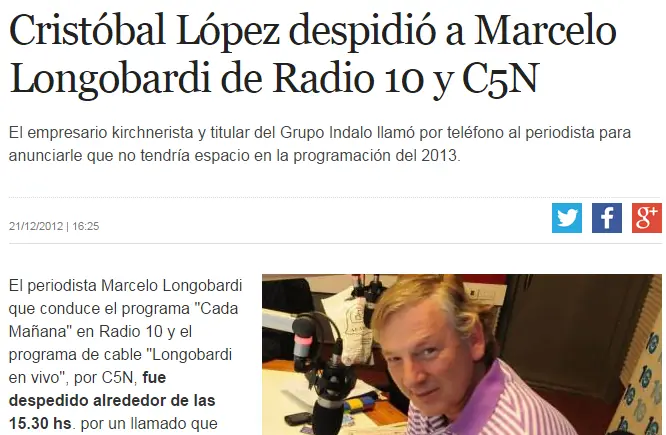Para los que tienen poca memoria.... Hace 3 años C5N (aún propiedad de Daniel Hadad, pero a punto de ser comprada por Cristobal Lopez) sacó del aire un programa en vivo, donde Marcelo Longobardi entrevistaba a Alberto Fernandez hablando mal de Cristina K. luego Marcelo terminó desmintiendo que fuera censura... mhmm y a los pocos meses.... Y AHORA VIENEN A HABLAR DE LIBERTAD DE EXPRESIÓN?