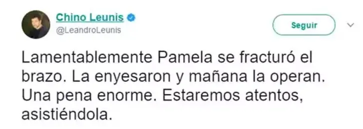 Una participante se quebró haciendo una pulseada en el programa del "Chino" Leunis La mujer se fracturó el brazo y deberá ser operada mañana. "Son cosas que pueden pasar, está dentro de las posibilidades, hay que tener mucho cuidado", afirmó el conductor Los programas conducidos por el Chino Leunis (36) siempre se han caracterizado por el humor y el entretenimiento. Sin embargo, esta vez entró en escena el dramatismo durante la edición de hoy de ¿En qué mano está?, el ciclo que conduce por la pantalla de Telefe. Es que en "La Dama de Hierro", una de las secciones del programa donde dos mujeres se enfrentan en una pulseada, se dio un hecho inédito que dejó atónitos a todos los testigos de la situación: la fractura de una de las participantes. En un momento de la competencia se escuchó un ruido que generó la preocupación y motivó que debieran ingresar los médicos, quienes se llevaron de inmediato a la mujer lesionada para que fuera atendida. "No sé si hizo ruido el brazo o el codo. Son cosas que pueden pasar, está dentro de las posibilidades, hay que tener mucho cuidado", expresó el conductor, conmovido por lo sucedido. "Lamentablemente Pamela se fracturó el brazo. La enyesaron y mañana la operan. Una pena enorme. Estaremos atentos, asistiéndola", comunicó el "Chino" a través de su cuenta de Twitter, una vez finalizado el programa. Lo cierto es que el infortunado suceso hizo recordar aquél registrado años atrás en La noche del domingo de Gerardo Sofovich, aunque en aquella oportunidad se trataba de desafíos entre competidores masculinos. EL VIDEO NO LO PONGO POR QUE ME VAN A ELIMINAR EL POST PERO ESTA LA FUENTE Y SI PONEN .. EN QUE MANO ESTA , TE SALTA TODO http://www.infobae.com/teleshow/paso-en-la-tv/2017/06/23/una-participante-se-quebro-haciendo-una-pulseada-en-el-programa-del-chino-leunis/
