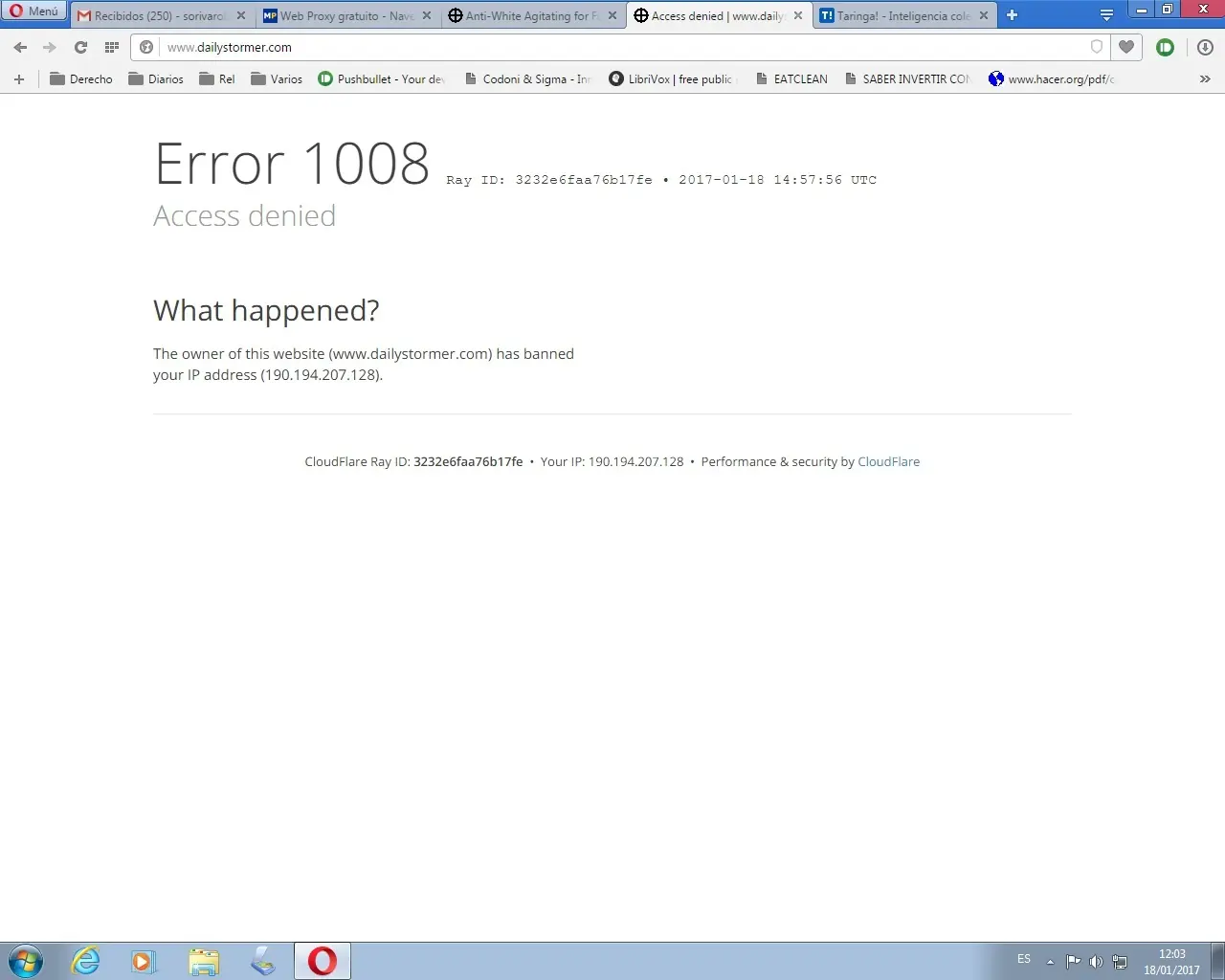 Hola gente, pésima noticia. Parece que bloquearon el dailystormer, la página Nacional Socialista más leída. Quiero ingresar a la página y pasa esto: Se puede ingresar con IP de otro país, a través de https://www.megaproxy.com.ar Y accederán a la página... Para los que hablen inglés es una excelente página, la recomiendo. Se ve que el lobby de (((ellos))) es muy fuerte en este país. (((Ellos))) nos dicen qué es lo que podemos leer y lo que no.