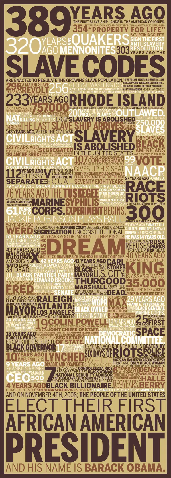 Registrate y eliminá la publicidad! Poster que resume 389 años. Desde el inicio de la esclavitud en America hasta Obama. Alguna de las traducciones link: http://app.zoomorama.com/1.0/zoombrowser@zoomorama.com/release/latest/browser.swf?indexURL=http://zml.zoomorama.com/1.0/legacyproxy/37a65081f8cfdfdab285d2141c135bf7/60ef54108675aa49b1c6f242e4962f8e/document.1.zml?indexURL=http://zml.zoomorama.com/1.0/legacyproxy/37a65081f8cfdfdab285d2141c135bf7/60ef54108675aa49b1c6f242e4962f8e/document.1.zml Estos son algunas de las fechas que incluye: Hace 389 años llegaba el primer barco con esclavos a las colonias americanas. Hace 354 años, John Castor se convierte en el primer esclavo reconocido legalmente, declarado "PROPIEDAD DE POR VIDA" Hace 178 años habian mas de 2 millones de esclavos negros en los EEUU Hace 143 años la esclavitud se elimina en los EEUU Hace solo 66 años el primer afroamericano es aceptado en la armada Hace tan solo 54 años la corte suprema declara inconstitucional la segregacion en las escuelas publicas Hace 45 años, Dr.Martin Luther King Jr. tenia un sueño; 5 años mas tarde seria asesinado, 35.000 resultarian heridos durante los enfrentamientos. Hace solo 10 años, James Byrd Jr es linchado por supremacistas blancos en Texas. Hace 4 años Barack Obama se convierte en el 5to senador negro en la historia de los EEUU Hace 5 meses Barack Obama es elegido el primer candidato democratico a la presidencia de los EEUU El 4 de Noviembre el pueblo de los EEUU eligen a su primer presidente afroamericano y su nombre es Barack Obama. Fuente