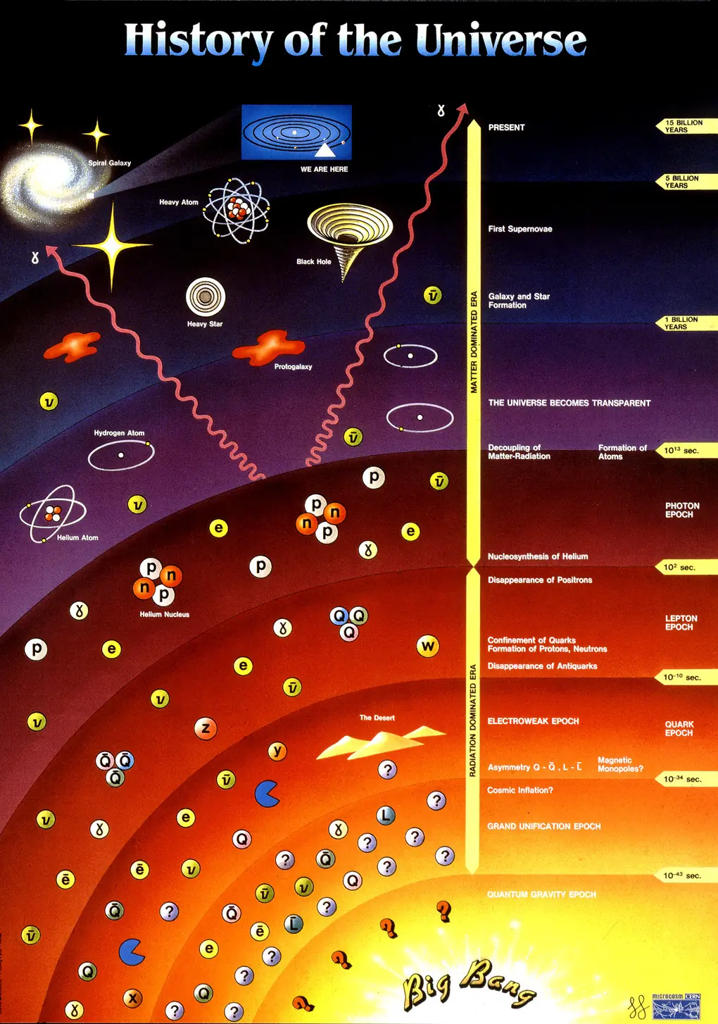 ¿Cómo fue el Big Bang…? Se cree que toda la materia conocida que compone al universo estaba concentrada en un punto que poseía un tamaño nulo y por lo tanto estaba infinitamente caliente, en un determinado momento explotó; conforme el universo se expandía la temperatura de la radiación disminuía (cuando el universo duplica su tamaño, su temperatura se reduce a la mitad). Un segundo después del Big Bang la temperatura habría descendido alrededor de diez mil millones de grados. Eso representa unas mil veces la temperatura en el centro del Sol, pero marcas tan altas solo se alcanzan en las explosiones de las bombas H. En ese momento el universo habría contenido fundamentalmente fotones, electrones, neutrinos, sus antipartículas, junto con algunos protones y neutrones. Alrededor de 100 segundos después del Big Bang la temperatura habría descendido a mil millones de grados que es la temperatura en el interior de las estrellas más calientes. A esta temperatura comenzaron a unirse protones y neutrones dando origen a deuterio helio litio berilo etc. Tan solo unas horas después del BIG BANG la producción de helio y otros elementos se habría detenido, después, durante el siguiente millón de años el universo continuo expandiéndose sin que ocurriese mucho más. Finalmente, una vez que la temperatura hubiese descendido a unos pocos miles de grados y los núcleos y los electrones no tuviesen ya suficiente energía para vencer la atracción electromagnética entre ellos estos , habrían comenzado a combinarse para formar átomos. El universo en conjunto habría seguido enfriándose y expandiéndose. En algunas regiones más densas esta expansión habría sido retardada y esto habría provocado que comenzasen a colapsar de nuevo, el tirón gravitatorio debido a las materias fuera de estas regiones podría empezar a hacerlas girar ligeramente. A medida que la región colapsante se hiciese más pequeña, daría vueltas sobre si misma mas deprisa, exactamente de la misma forma que los patinadores dando vueltas sobre el hielo giran mas deprisa cuando encogen sus brazos. Finalmente, cuando la región se hiciera suficientemente pequeña, estaría girando lo suficientemente deprisa como para compensar la atracción de la gravedad, y de este modo habrían nacido las galaxias giratorias en forma de disco. Otras regiones, que por azar no hubieran adquirido rotacion se convertirían en objetos ovalados llamados galaxias elípticas. En estas regiones, dejarían de colapsarse porque partes individuales de la galaxia estarían girando de forma estable alrededor de su centro aunque la galaxia en su conjunto no tendría rotación. A medida que el tiempo pasase, el gas de hidrogeno y helio de las galaxias se disgregaría en nubes más pequeñas, que comenzarían a colapsarse debido a su propia gravedad. Conforme se contrajesen los átomos dentro de ellas y colisionasen unos con otros, la temperatura del gas aumentarían hasta que finalmente estuviese lo suficientemente caliente como para iniciar reacciones de fusión nuclear. Estas reacciones convertirían el hidrogeno en gas helio y el calor desprendido aumentaría la presion lo que impediría a las nubes seguir contrayéndose. Esas nubes permanecerían estables en ese estado durante mucho tiempo como estreIlas del tipo de nuestro Sol quemando hidrogeno para formar helio e irradiando la energía resultante en forma de calor y luz. Las estrellas con una masa mayor necesitarían estar mas calientes para compensar su atracción gravitatoria más intensa lo que haría que las reacciones de fusión nuclear se produjesen mucho más rápido, tanto que consumirían su hidrogeno en un tiempo tan corto como cien millones de años. Se contraerían ligeramente y al calentarse mas empezarían a convertir el helio en elementos mas pesados como carbono u oxigeno. Esto sin embargo no liberaría mucha más energía de modo que se produciría una crisis, las regiones centrales de la estrella colapsarían hasta un estado muy denso, tal como una estrella de neutrones o un agujero negro. Las regiones externas de la estrella podrían a veces ser despedidas en una tremenda explosión, Ilamada supernova que superaría en brillo a todas las demás estrellas juntas de su galaxia. Algunos de los elementos mas pesados producidos hacia el final de la vida de la estrella serian arrojados de nuevo al gas de la galaxia y proporcionarían parte de la materia prima para la próxima generación de estrellas. Nuestro propio Sol contiene alrededor de un 2% de esos elementos mas pesados, ya que es una estrella de segunda o tercera generación, formada hace unos cinco mil millones de años a partir de una nube giratoria de gas que contenía los restos de supernovas anteriores. La mayor parte del gas de esa nube, o bien sirvió para formar el Sol o bien fue arrojada fuera, pero una pequeña cantidad de elementos mas pesados se acumularon juntos para formar los cuerpos que ahora giran alrededor del Sol como planetas al igual que la tierra.