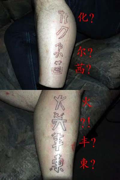A menos que tengas un familiar, amigo,conocido que sea chino o japones, no te tatues letras orientales, ya que la mayoria de las veces estos caracteres estan mal escritos. estas fotos recopilan algunos de los errores que suelen aparecer en los tatuajes. Que en el peor de los casos puede hacer que el significado cambie totalmente. En la Fuente que puse mas abajo tienen muchas mas fotos que la pagina viene recopilando desde hace varios años, incluidos errores en carteles, y demas cosas. espero que les interese un poco En realidad tendria que ser: 銭 ぶく あ 痛い 恋 Tendria que ser: 畏 牯 鼠 Fuente: http://www.hanzismatter.com/