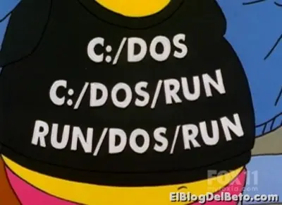 El sistema operativo DOS siglas de “Disk Operating System” se caracterizaba por la forma de navegación o ingreso mediante la estructura de oredenes por ejemplo: C:>dir; donde DIR: muestra un listado de archivos, que están contenidos en un directorio. En todo si tu te encuentras escribiendo este tipo de ordenes es porque ya estas en el sistema DOS por lo tanto el chiste de los Simpson se refiere a que alguien estupidamente que ya se encuentra en DOS eesta dando la orden al sistema para que que ingrese a DOS al escribir: C:dos Lo que es peor aun es que al no recibir respueesta escribe con insistencia: COSRUN y luego de forma desesperada escribe:C:RUN/DOS/RUN eso significa realmente