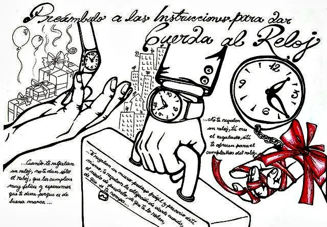 Preámbulo a las instrucciones para dar cuerda a un reloj Piensa en esto: cuando te regalan un reloj te regalan un pequeño infierno florido, una cadena de rosas, un calabozo de aire. No te dan solamente el reloj, que los cumplas muy felices y esperamos que te dure porque es de buena marca, suizo con áncora de rubíes; no te regalan solamente ese menudo picapedrero que te atarás a la muñeca y pasearás contigo. Te regalan —no lo saben, lo terrible es que no lo saben—, te regalan un nuevo pedazo frágil y precario de ti mismo, algo que es tuyo pero no es tu cuerpo, que hay que atar a tu cuerpo con su correa como un bracito desesperado colgándose de tu muñeca. Te regalan la necesidad de darle cuerda todos los días, la obligación de darle cuerda para que siga siendo un reloj; te regalan la obsesión de atender a la hora exacta en las vitrinas de las joyerías, en el anuncio por la radio, en el servicio telefónico. Te regalan el miedo de perderlo, de que te lo roben, de que se te caiga al suelo y se rompa. Te regalan su marca, y la seguridad de que es una marca mejor que las otras, te regalan la tendencia de comparar tu reloj con los demás relojes. No te regalan un reloj, tú eres el regalado, a ti te ofrecen para el cumpleaños del reloj. Instrucciones para dar cuerda al reloj Allá al fondo está la muerte, pero no tenga miedo. Sujete el reloj con una mano, tome con dos dedos la llave de la cuerda, remóntela suavemente. Ahora se abre otro plazo, los árboles despliegan sus hojas, las barcas corren regatas, el tiempo como un abanico se va llenando de sí mismo y de él brotan el aire, las brisas de la tierra, la sombra de una mujer, el perfume del pan. ¿Qué más quiere, qué más quiere? Átelo pronto a su muñeca, déjelo latir en libertad, imítelo anhelante. El miedo herrumbra las áncoras, cada cosa que pudo alcanzarse y fue olvidada va corroyendo las venas del reloj, gangrenando la fría sangre de sus rubíes. Y allá en el fondo está la muerte si no corremos y llegamos antes y comprendemos que ya no importa. Julio Cortázar, Historias de cronopios y de famas