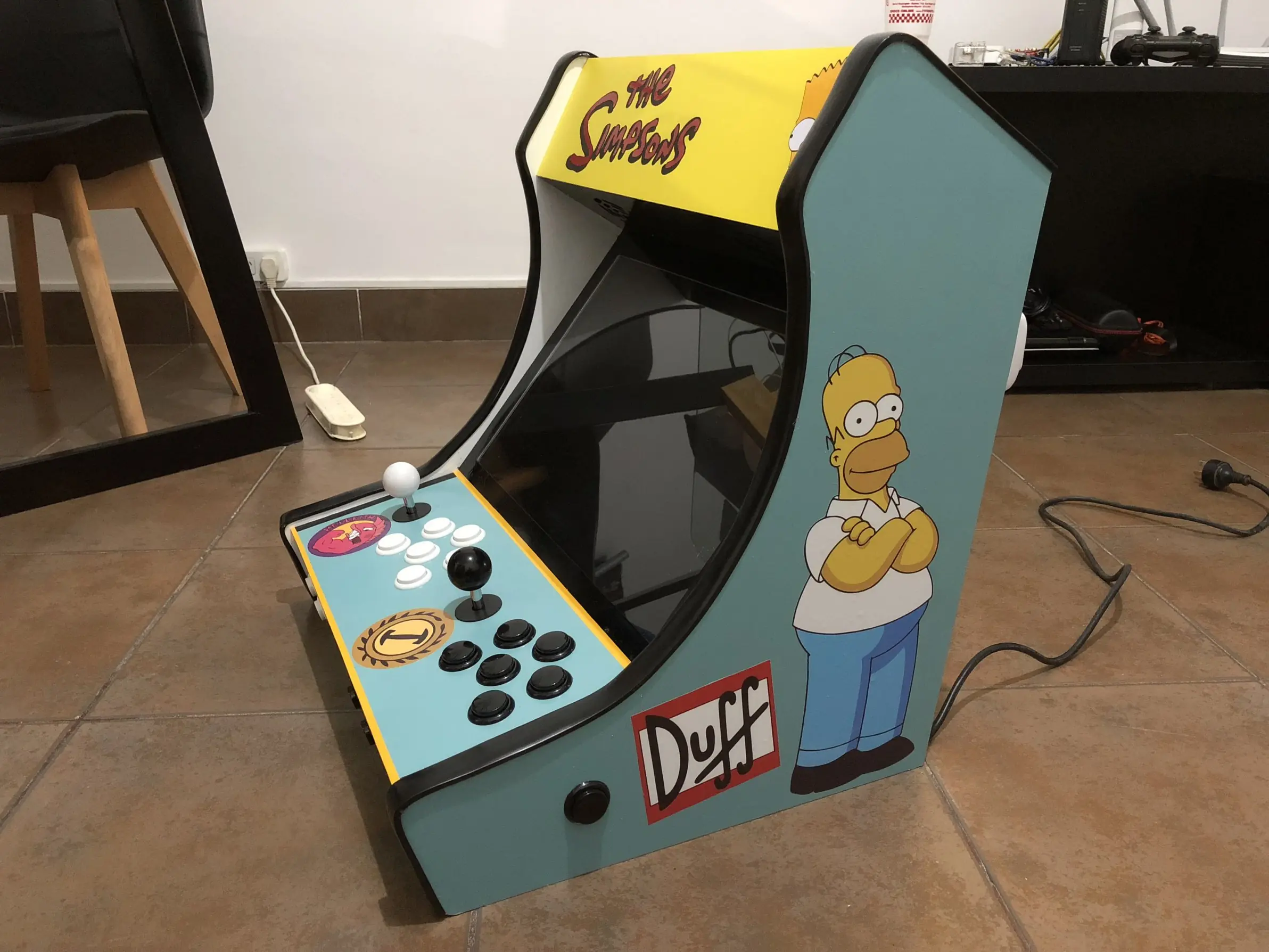 Luego de hacer un par de laburitos como estos: AMBILIGHT CON RASPBERRY FOTOCABINA CON RASPBERRY CONTROL REMOTO PARA GOPRO HERO 4 Llega... Mi Arcade (Bartop) Simpson Hacian un tiempo que tenia tirado y juntando mugre un viejo mother, un par de memorias RAM, un par de discos rigidos y en lugar de tirarlos a la basura, decidi invertir unos mangos mas y comprar lo que me faltaba para armar mi Bartop Arcade que quedo de la siguiente manera. Hardware y materiales utilizados Motherboard Asus P5LP-LE Micro Pentium D 4 GB RAM DDR2 Disco Rigido de 320 GB SATA Fuente ATX Monitor Acer 19" Wide Parlantes Kit de Botones Mueble Pistola de pegamento Tornillos Cableado de electronica En primer lugar me traje de Estados Unidos un set de botones para dos player con palancas. Lo pague 40 dolares, la mitad de lo que cuesta acá uno nacional. Luego, encargue por Mercadolibre, el mueble con una persona que los arma (La carpintería no es lo mio). Este es el modelo Bartop, pero hay varios modelos que arma y le podes poner la configuración de botones que mas te guste. Les dejo el link mas abajo, junto con el de los botones de Amazon por si les interesa mirar. El mueble es lo ultimo que armas, primero viene toda la etapa de configuración de software sobre la PC. En mi caso use mother, micro y memorias que tenia tirados de PC viejas que estaban totalmente sin uso. Para correr los juegos retro recontra alcanza con un Dual-Core y 4 GB de RAM. El sistema operativo que use es RetrOS 2.0.3. Es un sistema basado en Windows 7, totalmente recortado y adaptado para ejecutar cualquier Front-End de emuladores. En mi caso, use un Front-End llamado Maximus Arcade. Probe el Hyperspin, pero come muchos recursos y es demasiado complicado de configurar. Ademas del Maximus Arcade, uso en conjunto el "JoyToKey". El software JoyToKey merece una explicación bastante detallada, ya que es el que te permite adaptar cualquier joystick (el conjunto de palancas y botones funciona como uno) mapeando boton-teclado. Al que le interese me puede consultar y les explico un poco mas detallado. Respecto a lo que son juegos hay dos opciones, la del artesano y la del vago. El artesano recopila sus propios juegos, emuladores y los configura uno por uno, el vago compra por MercadoLibre a un buen cristiano que se dedico a armar todo, un hermoso pack de roms de muchas consolas con sus respectivos emuladores e imagenes. Yo opte ser vago, claro esta. Descargue de internet el Maximus Arcade y le meti dentro toda la estructura ya armada con varios Emuladores de consola, ya conocidos por todos, entre ellos, Nintendo, Super Nintendo, Playstation One, MAME, Sega, etc. Con todo configurado llego el momento de meter todo adentro de la caja, previo armado de ella. Era algo que me inquietaba, porque viendo el tamaño final del arcade parece que todo no entra, pero con paciencia se logra. Se ponen por partes los botones en la botonera y luego se arma la estructura, previa pintada de las partes con aerosol. Teniendo la estructura armada con los botones colocados y cableados, ubico los parlantes sobre el hueco superior. Estos parlantes originalmente funcionan con el amplificador que viene incluido, pero es a pila. Entonces saque las chapitas del portapilas y solde un cable USB a los contactos para que tengan corriente cada vez que se prende el Arcade, quedando algo como esto. Ademas, delante de los parlantes, dentro del hueco superior puse una tira de Led blanco, conectada directamente a la fuente y pasando por un interruptor. Una vez encendido, con una tecla podes prender y apagar la Luz. Para tapar el hueco le puse un acrilico transparente, ploteado con vinilo translucido amarillo, para que cuando se encienda la luz led ilumine. Ademas, para tapar los cantos de la madera le puse los burletes o tapacantos de goma negra. Una vez terminada esa parte, para cubrir el borde plastico del monitor y que quede prolijo, compre un acrilico que pinte de negro con aerosol en todo el borde. Colocado, solo deja ver la pantalla. Detalles que suman - Le agregue en el lado de atrás un puerto USB con un alargador desde uno de los USB de la PC. Sirve para poder conectar un teclado y un mouse en caso de tener que configurar algo extra o agregar algún emulador nuevo en el futuro. - Deje un cable de red para conectar directamente al router para darle red e internet en caso de necesitarse. - Puse un ventilador para que saque el calor que generan la PC y el monitor en funcionamiento. Esto es clave porque el calor es bastante. - En lugar de atornillar la tapa le puse velcro para que sea mas fácil sacar y poner en caso que haya que tocar algo. - El interruptor de encendido lo extendí para dejarlo accesible sobre la parte trasera, para poder encender el Arcade. Así quedo el interior, todo apretadito, puesto como un tetris. Solo faltaba decorar Algunas cosas ya estaban puestas, faltaban todos los costados. Mande a imprimir en vinilo adhesivo mate varias imagenes de los Simpsons y las pegue. A cargo de la mujer de la casa, con su inmejorable pulso y paciencia, a darle los detalles en pintura a las cosas que no se podían cortar a tijera. Y así es como quedo el laburito final después de un largo pero entretenido mes de configurar y re-configurar, armar, atornillar y desatornillar. PD: Agradecimiento especial a la pistola de pegamento y precintos que hace que todo sea mucho mas fácil de sostener en su lugar. Les dejo la certificada y algunos videos del Arcade Simpson funcionando! link: https://www.youtube.com/watch?v=h1t5aeRkc5U&feature=youtu.be link: https://www.youtube.com/watch?v=3kG2U6CRNJY&feature=youtu.be Links del Mueble y los Botones BOTONES MUEBLE