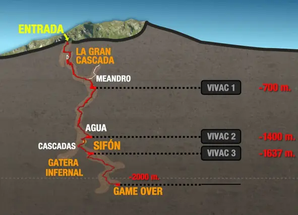 Cueva de Voronia La cueva de Voronia es el sistema de cuevas más profundo del mundo. Está situado en el macizo Arabika en la cordillera de Gagra, en Abjasia, Georgia. La cueva se divide en dos ramas, la Novokuibyshevskaya, con 1,300m de profundidad, y la principal con 2,196m, y que se ramifica en varias vertientes menores. En 2004, durante tres diferentes expediciones se registró que la cueva tenía una profundidad cada vez más grande. Por primera vez en la historia de la espeleología se rebasaron los 2,000m de profundidad. Fue en las expediciones de 2005 que se encontró que la cueva era aún más profunda, confirmándose la profundidad actual de 2,196m. La primera vez que la cueva fue explorada fue en 1960, por un equipo de espeleólogos georgianos que logró descender unos 95m. Posteriormente, la cueva fue investigada y olvidada varias veces, estableciéndose cada vez nuevos récords, pero nunca alcanzando el fondo. Ha sido una labor de varias generaciones de espeleólogos lograr determinar que este laberinto de piedra es la cueva más profunda de la que se tiene noticia, y quizá nuevas generaciones encuentren pronto otros pasadizos que resulten en nuevas ramas que nos adentren aún más en las insondables profundidades del planeta