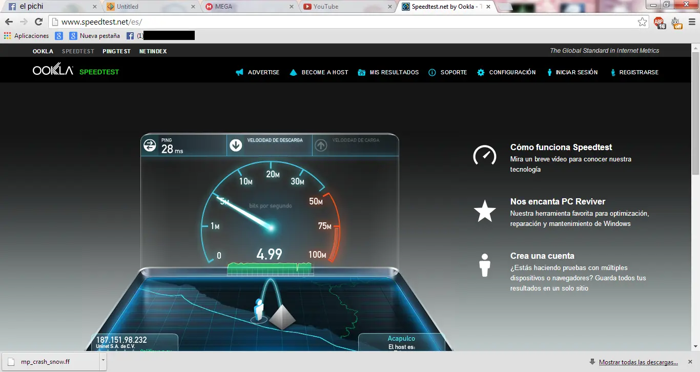 Hola taringueros, hoy paso algo bastante raro que nunca crei que pasaria, creo el post en forma de discutir si no soy el unico que le ah pasado ya que mi zona donde vivo parece ser que fui el unico que se beneficio.. Bueno 20 de dic. Era un dia soleado y perfecto, y yo, taringueando como siempre metido en forobardos me percato que la carga de paginas es mas rapida a lo que voy a speedtest.net para verificar que cambio.. Mi internet es de la compañia telmex pago algo parecido a $400 mxn - 30 usd (notese mi Internet descargaba un tanto... 180kb/s ..algo asi como 1.5 mbps ) y a continuación me aparece esto: me quede flipao tio ostia! era algo asi como 500kb/s - 4.8 mbps hoy 22 de dic. entro para comprobar que aun continuaba veloz... y si continuaba. entro a demas paginas a perder el tiempo..facebook, twitter ,youtube en lo que me doy cuenta que estaba reproduciendo videos 720p sin ningun problema.. (obra del diablo) que entro de nuevo a speedtest a comprobar que tal seguia mi internet y encuentro esto: la puta que me pario.. 10 mbps de un dia para otro descargaba a 180 kb/s ..y paso a 1000 kb/s les recuerdo que pago 400 pesos por el servicio y aun no tengo idea porque paso esto espero que a alguien mas le alla sucedido , saludo linces!