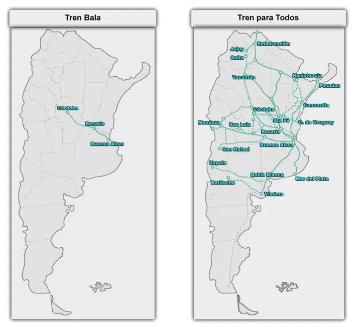 Tren para todos: * Desarrollaría una velocidad de 120 km por hora (tres veces el promedio de velocidad actual). * Una inversión de 3.100 millones de dólares. Casi 1.900 millones de dólares menos que para el tren bala. (*) * Proyectando 18.000 km de vías reconstruídas a nuevo: 7.000 km de vías para trenes de pasajeros y de carga y 11.000 más sólo para trenes de carga. Unas 300 locomotoras, 900 coches de pasajeros y 15.000 vagones para carga. * Los pasajes costarían varias veces menos de lo que cuesta actualmente un pasaje en micro. * Llegaría a todas las zonas del país (Noroeste, Noreste, Cuyo, Centro y Patagonia), a todas las grandes ciudades, y a cientos de pueblos que volverían a conectarse con las grandes ciudades, bajando costos de transporte y reactivando las economías regionales. * El "tren de todos", utilizaría tecnología nacional y del Mercosur al alcance de las capacidades de nuestro país. * El proyecto reimpulsa la industria ferroviaria nacional con la construcción de vagones, el ensamble de locomotoras y la producción de repuestos, generando trabajo. * El Banco Central tiene reservas por 50.000 millones de dólares, es decir que se puede hacer sin aumentar ni un centavo la deuda externa. Tenemos estudiado el proceso de recuperación de los cinco principales ramales ferroviarios para cargas y pasajeros, que totalizan unos 7.000 Km. de vías férreas de corredores troncales y acondicionar otros 11.000 para que nos permita tener unidas nuestras principales economías regionales. Con los millones de litros de combustibles no dilapidados, la dinámica generada en nuestras economías regionales y sus consecuentes aportes tributarios, los ahorros provenientes del menor costo de las tarifas de fletes, de los seguros de vida con la reducción de la siniestralidad vial, de los costos de reparación de rutas, autopistas y calles urbanas rotas por pesadas unidades de transporte automotor, se pueden recuperar miles de kilómetros de servicios ferroviarios de primer nivel. Hablar de primer nivel es disponer de coches de pasajeros cómodos, confortables y que a velocidades de 120/130 km. por hora, satisfagan las necesidades de la población con mucho menos costo de pasaje que el de un propuesto “tren bala” de indefinidos montos de inversiones. El mercado inicial, contempla la recuperación de la demanda de los niveles de 1989 estimado en unos 12 millones de pasajeros viaje a distancias medias de alrededor de 500 Km., esto daría un transporte mínimo de 6.000 millones de pasajeros kilómetro por año, siendo estos niveles fácilmente superables por cuanto se mide ese año en el que se desalentaba el uso del ferrocarril y no sería aventurado predecir un futuro del doble de esa estimación. Este transporte obliga a despachar 23.791 trenes de 10 coches de pasajeros y 380.952 ómnibus por año, que concentrados en 220 días y 12 horas diarias representan un despacho de 142 ómnibus por hora a las rutas del país. Imaginemos ese flujo potenciado en los tiempos de vacaciones y en las rutas con destinos turísticos, avalando lo que decimos de la reducción de la siniestralidad a partir del transporte ferroviario. Un tren de pasajeros con 10 coches, 3 furgones y una locomotora de 1300 HP con capacidad para transportar 512 personas, demandaría un equivalente a 16 ómnibus, con motores de 260 HP para igual cometido de transporte aplicando 3,2 veces más de potencia, por lógica con mayor consumo de combustibles. Más potencia es más consumo, más consumo es más combustibles líquidos, más polución ambiental y muchas mas vidas perdidas. RED BASICA (7.000 Km.) (Velocidades entre 90 y 120 Km) pasajeros 1) Tucumán-Córdoba-Rosario-Buenos Aires 2) Viedma-Bahía Blanca-Olavarría-Bs As-Mar del Plata-Bs As 3) Mendoza-Buenos Aires 4) Pocitos-J.V.Gonzalez-Avia Terai-Resistencia-Tostado-Sta. Fe 5) Posadas- Buenos Aires La red básica se estima realizarla con rieles soldados, 2 (dos) pasos a nivel por ciudad más los que las municipalidades o comunas deseen, operen y financien RED AFLUENTE (11.000 Km) Líneas y ramales de conexión Mercado de cargas estimado a datos del año 2006 en millones de Tn 225 Demanda estimada del plan de Proyecto Sur y al solo efecto de ejemplo: 32 millones de Tn Inversión infraestructura red básica imputada a cargas… U$S 720 millones Inversión ramales de afluentes........... U$S 546 millones Estamos entonces con una red mejorada de 18.000 Km.- para la que se invertiría la suma de U$S 1.246 millones Reponiendo las conexiones entre nuestras economías regionales, rompiendo el aislamiento de nuestros pueblos del interior y generando una demanda de puestos de trabajo que permitirá el retorno de muchos conciudadanos que migraron a las grandes ciudades por falta de oportunidades dejando sus raíces, tradiciones, familias y culturas. Sobre la red básica podrán circular trenes con cargas perecederas y semiperecederas a velocidades de entre 60 y 90 Km/hora según trochas Recordemos que un tren con 36 vagones de 42 Tn. equivale a 1500 toneladas transportadas, para las que estamos usando hoy 50 camiones de 30 Tn. rompiendo rutas, autopistas y calles urbanas que los intendentes y presidentes de comunas deben afrontar con sus magros presupuestos. Un tren necesita 2 maquinistas, un camión 2 conductores y si un tren suple 50 camiones, es decir 100 conductores, qué medio hace el mejor uso de estos recursos? El Movimiento Tren para Todos no quiere la desocupación de los camioneros, quiere que el camión se use para corta y media distancia y le permita a los conductores o camioneros propietarios de sus unidades una jornada laboral de no más de ocho horas, el retorno a sus hogares y el descanso y disfrute de sus descansos, su recreación normal y una vida en familia. Esa sería la dignidad a la que aspiran y por la que sus gremios deberían luchar para hacer realidad la tantas veces prometida JUSTICIA SOCIAL. Para mayor información sobre nuestra propuesta consu