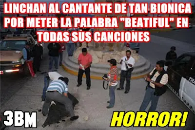 Fanáticos de la banda "Tan Bionica" se revelaron contra los propios integrantes del conjunto cuando en la octava canción de un recital metieron por enésima vez la palabra "beatiful", el mundo de la música está conmocionado por este sangriento hecho. Se dice que el Pity Alvarez está pensando seriamente en quitarle la palabra "perro" al 90% de las canciones que compuso. Los hechos ocurrieron esta madrugada en momentos en que la banda Tan Bionica cantaba su octavo tema del repertorio musical preparado expecialmente para este recital, ante unas 500 personas, cuando se desató la peor tragedia musical de la historia que se recuerde. Según los testigos del trágico hecho, antes de llegar al estribillo, varios fanáticos entraron en cólera cuando por enesima vez la palabra "beatiful" era pronunciada una vez más en una canción, momento en el cual se levantaron de sus asientos y se dirigieron hacia el escenario, mientras otros se erigieron hacia los costados para que los musicos no tengan escapatoria y obtengan su merecido. Los agentes de seguridad contratados por el grupo para protegerlos, aprovecharon la "oportunidad" y también los atacaron con una inisuitada violencia. Los musicos fueron trasladados de inmediato hacia un hospital cercano, los cuales tambien fueron atacados durante el trayecto por los ambulancieros y una vez que llegaron al mencionado lugar por los mismos doctores, enfermeros y cirujanos.
