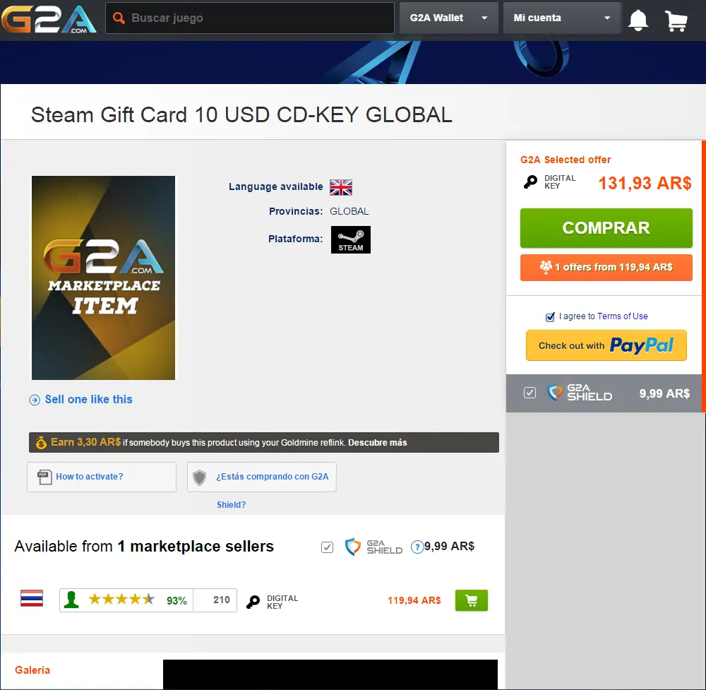 Buenas tardes Virgomaquinolas hago este post en cuestion porque se me ocurrió añadir 10 USD a mi cuenta steam mediante la pagina G2A Bueno, yo le quiero comprar al revendedor de abajo que me cobra 119,94 ARS mas el shield quedarìa 129,93ARS Ahora como quiero pagarlo con pagofacil accedo a esa parte Pero cuando hago click en pago facil me aparece que me quieren agregar una tasa como de 87 mangos ESTO me dice que tendria que pagar. Cual es la razón maquinas? Yo la semana pasada compre el CS GO de la misma manera y no me cobraron ningun impuesto de nada