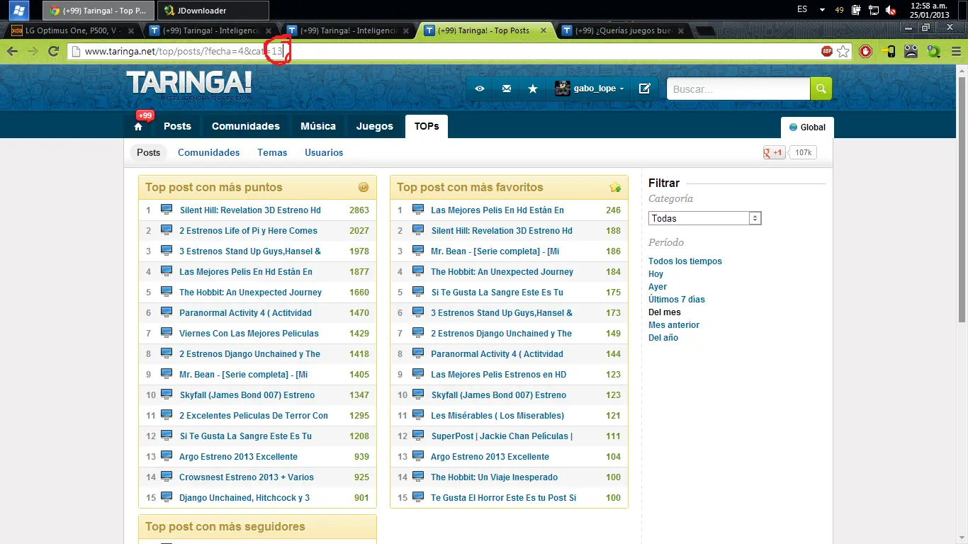 Como hemos visto las diferentes categorias se ido reduciendo... Ahora te voy a enseñar como recuperar los tops de las categorias que han sido escondidas: Primero tienen que abrir el browser de su preferencia, y a continuación deben ingresar a estos links, i voulá, ya tienen los tops de las categorias ocultas, muy util cuando, ultimamente tenes que sortear infinidad de posts crap, y tenes que encontrar una pelicula, o juego... Top tv-peliculas-series: http://www.taringa.net/top/posts/?fecha=1&cat=13 Top juegos: http://www.taringa.net/top/posts/?fecha=1&cat=0 Top links: http://www.taringa.net/top/posts/?fecha=1&cat=2 Top musica: http://www.taringa.net/top/posts/?fecha=1&cat=8 Top downloads: http://www.taringa.net/top/posts/?fecha=1&cat=9 Top celulares: http://www.taringa.net/top/posts/?fecha=1&cat=17 Top comics: http://www.taringa.net/top/posts/?fecha=1&cat=19 Top Anime: http://www.taringa.net/top/posts/?fecha=1&cat=32 Bueno eso es todo, compártanlo para que mas users de taringa lo sepan!!